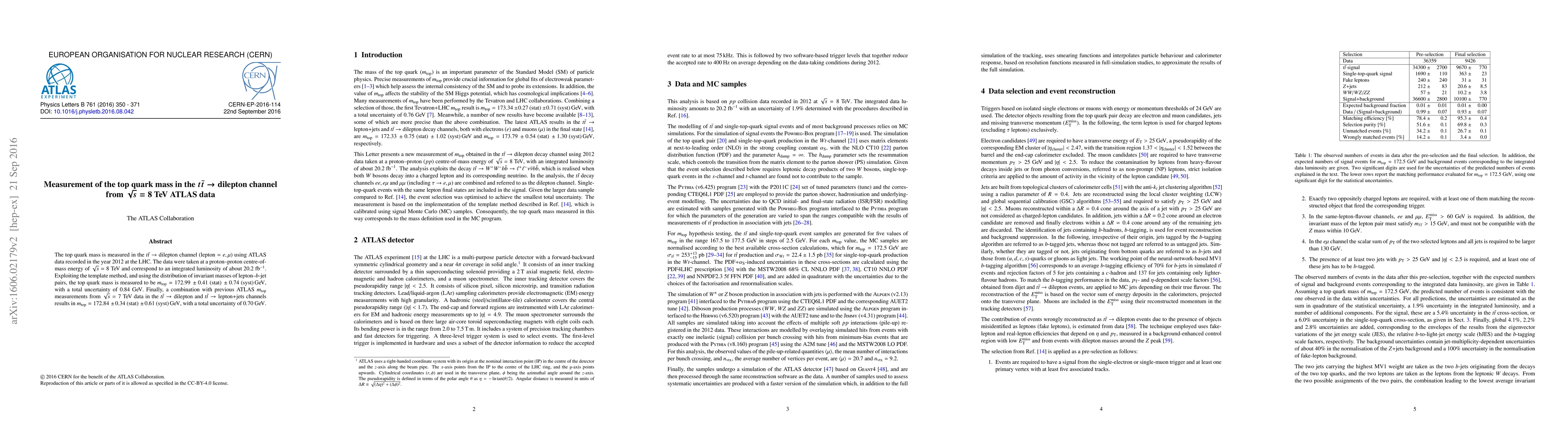 The top quark mass is measured in the $t\bar{t}\to$ dilepton channel (lepton $= e, \mu$) using ATLAS data recorded in the year 2012 at the LHC. The data were taken at a proton--proton centre-of-mass energy of $\sqrt{s}=$ 8 TeV and correspond to an integrated luminosity of about 20.2 fb$^{-1}$. Exploiting the template method, and using the distribution of invariant masses of lepton--b-jet pairs, the top quark mass is measured to be $m_{top} =$ 172.99 $\pm$ 0.41 (stat) $\pm$ 0.74 (syst) GeV, with a total uncertainty of 0.84 GeV. Finally, a combination with previous ATLAS $m_{top}$ measurements from $\sqrt{s}=$7 TeV data in the $t\bar{t}\to$ dilepton and $t\bar{t}\to$ lepton+jets channels results in $m_{top} =$ 172.84 $\pm$ 0.34 (stat) $\pm$ 0.61 (syst) GeV, with a total uncertainty of 0.70 GeV.