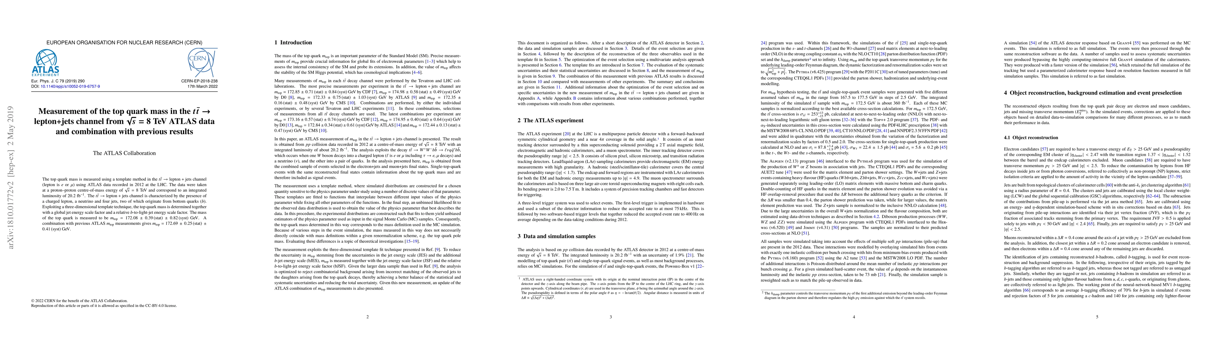 The top quark mass is measured using a template method in the $t\bar{t}\to$ lepton+jets channel (lepton is $e$ or $\mu$) using ATLAS data recorded in 2012 at the LHC. The data were taken at a proton-proton centre-of-mass energy of $\sqrt{s}=8$ TeV and correspond to an integrated luminosity of 20.2 fb$^{-1}$. The $t\bar{t}\to$ lepton+jets channel is characterized by the presence of a charged lepton, a neutrino and four jets, two of which originate from bottom quarks ($b$). Exploiting a three-dimensional template technique, the top quark mass is determined together with a global jet energy scale factor and a relative $b$-to-light-jet energy scale factor. The mass of the top quark is measured to be $m_{top}= 172.08 \pm 0.39 (stat) \pm 0.82 (syst)$ GeV. A combination with previous ATLAS $m_{top}$ measurements gives $m_{top}= 172.69 \pm 0.25 (stat) \pm 0.41 (syst)$ GeV.