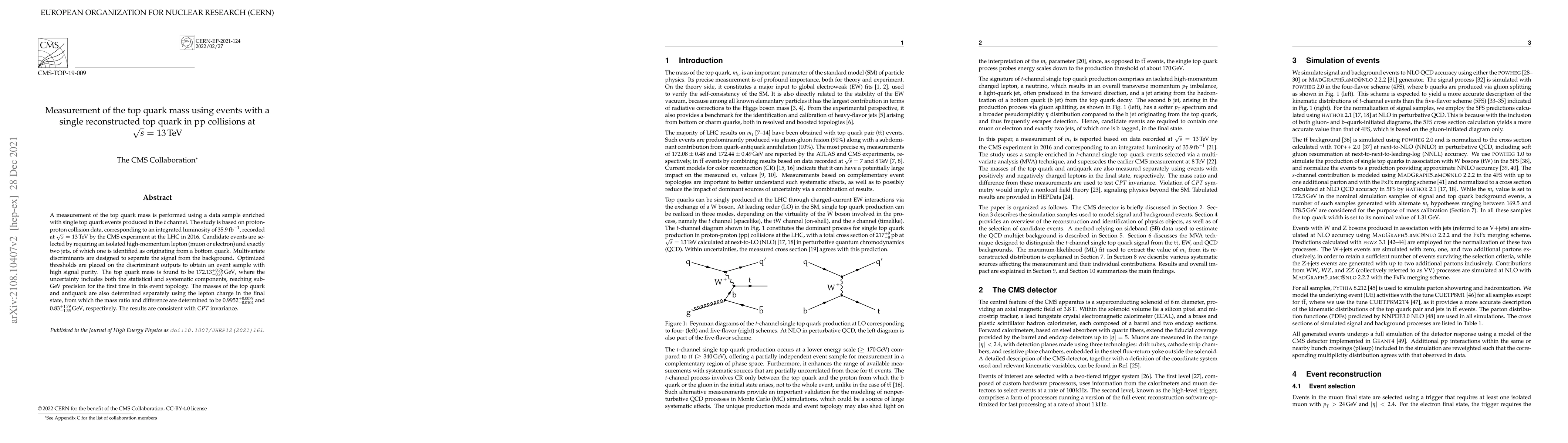 This study measures the top quark mass using single top quark events in the $t$ channel from proton-proton collisions at 13 TeV, achieving sub-GeV precision. The CMS experiment at the LHC recorded data corresponding to 35.9 fb$^{-1}$, resulting in a top quark mass measurement of 172.13 ± 0.76 GeV, consistent with $CPT$ invariance.