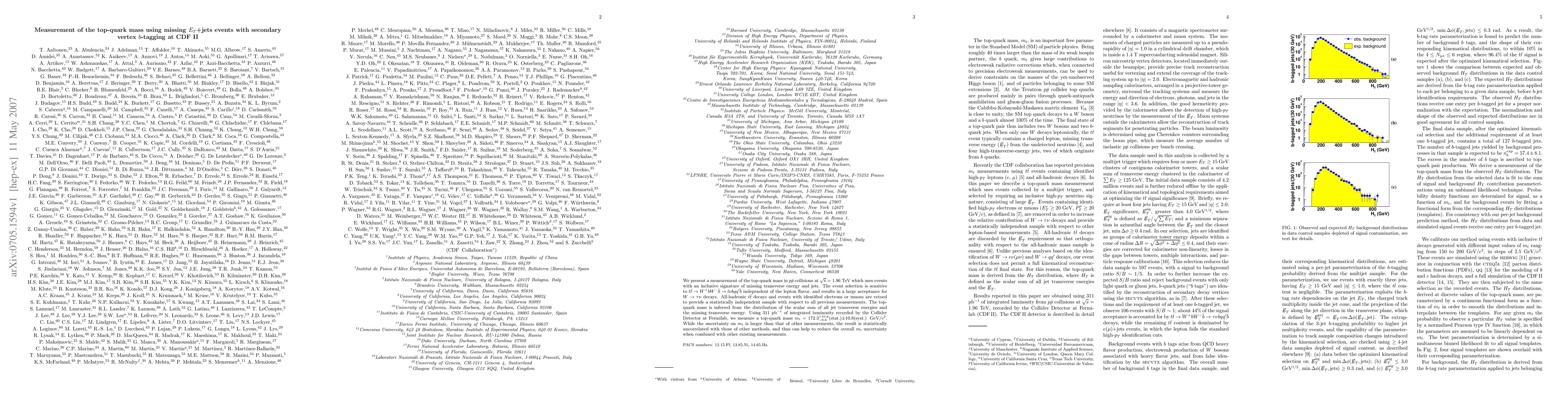 We present a measurement of the top-quark mass in $p\bar p$ collisions at \hbox{$\sqrt{s}=1.96$} TeV which uses events with an inclusive signature of missing transverse energy and jets. % The event selection is sensitive to $t\bar t\to W^+bW^-\bar b\to l\nu b q q^\prime \bar b$ independent of the lepton flavor, and results in a large acceptance for $W\to\tau\nu$ decays. % All-hadronic $t\bar t$ decays and events with identified electrons or muons are vetoed to provide a statistically independent sample with respect to all previous measurements. % The top-quark mass is inferred from the distribution of the scalar sum of all jet transverse energies and the missing transverse energy. Using 311 pb$^{-1}$ of integrated luminosity recorded by the Collider Detector at Fermilab, we measure a top-quark mass $m_t = 172.3 ^{+10.8}_{-9.6}$(stat.)$\pm 10.8$(syst.) GeV/$c^2$. While the uncertainty on $m_t$ is larger than that of other measurements, the result is statistically uncorrelated with those of other methods, and thus can help to reduce the overall $m_t$ uncertainty when combined with other existing measurements.