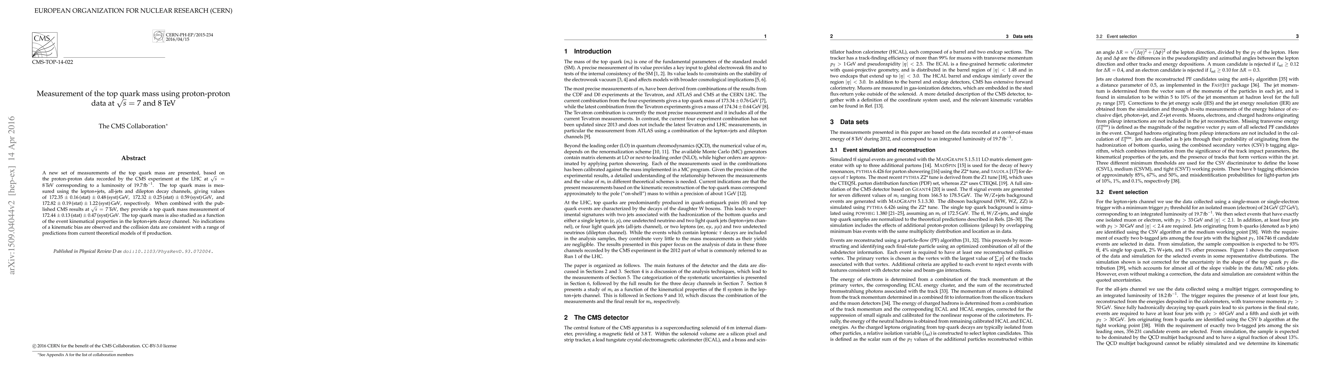 This paper reports new measurements of the top quark mass from proton-proton collisions at 7 and 8 TeV using the CMS experiment, yielding a combined mass of 172.44 ± 0.13 (stat) ± 0.47 (syst) GeV. No kinematic bias is observed, and the results align with theoretical predictions.