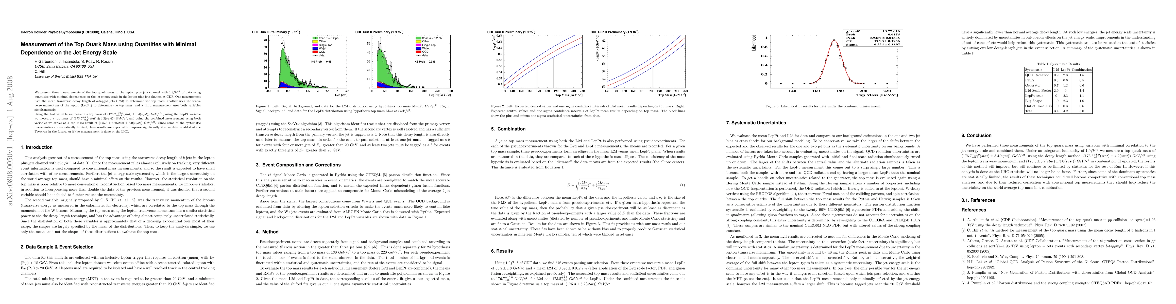 We present three measurements of the top quark mass in the lepton plus jets channel with 1.9 fb-1 of data using quantities with minimal dependence on the jet energy scale in the lepton plus jets channel at CDF. One measurement uses the mean transverse decay length of b-tagged jets (L2d) to determine the top mass, another uses the transverse momentum of the lepton (LepPt) to determine the top mass, and a third measurement uses both variables simultaneously. Using the L2d variable we measure a top mass of 176.7 (+10.0) (-8.9) (stat) +/- 3.4 (syst) GeV/c^2, using the LepPt variable we measure a top mass of 173.5 (+8.9) (-9.1) (stat) +/- 4.2 (syst) GeV/c^2, and doing the combined measurement using both variables we arrive at a top mass result of 175.3 +/- 6.2 (stat) +/- 3.0 (syst) GeV/c^2. Since some of the systematic uncertainties are statistically limited, these results are expected to improve significantly if more data is added at the Tevatron in the future, or if the measurement is done at the LHC.