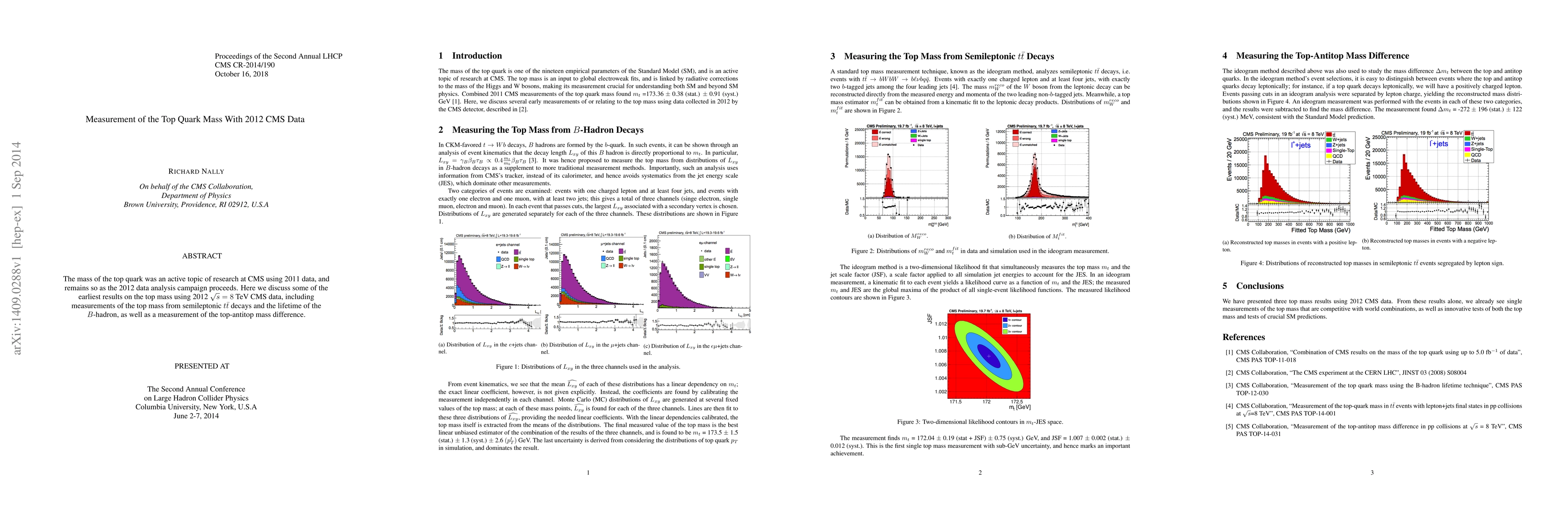 Researchers at CMS used 2012 data to measure the top quark mass, finding results from semileptonic tar{t} decays and a measurement of the top-antitop mass difference.