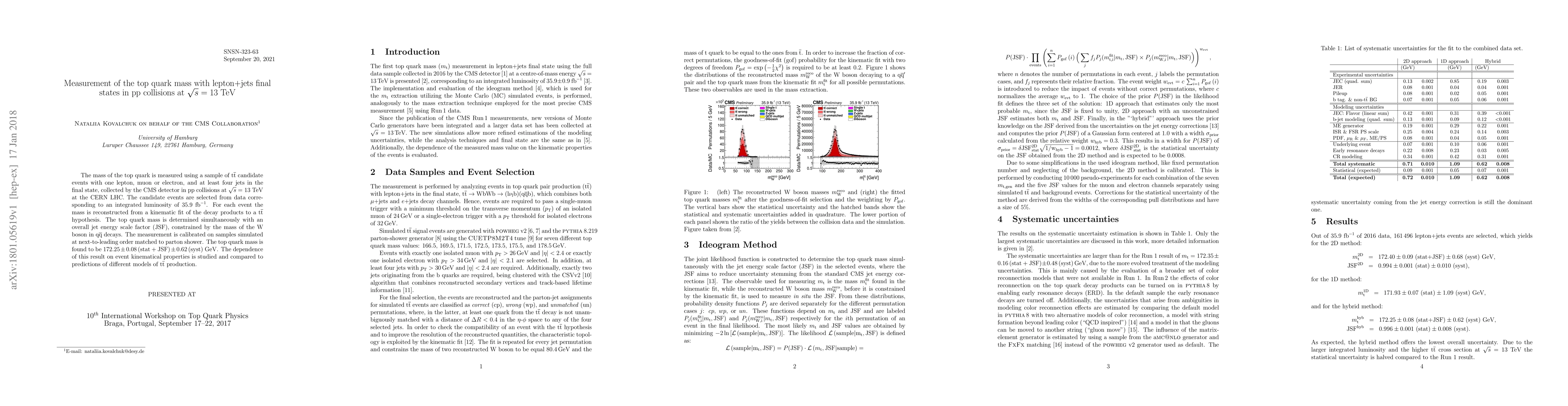 The mass of the top quark is measured using a sample of $\rm{t}\bar{\rm t}$ candidate events with one lepton, muon or electron, and at least four jets in the final state, collected by the CMS detector in pp collisions at $\sqrt{s}=13~\mathrm{TeV}$ at the CERN LHC. The candidate events are selected from data corresponding to an integrated luminosity of $35.9~\mathrm{fb}^{-1}$. For each event the mass is reconstructed from a kinematic fit of the decay products to a $\rm{t}\bar{\rm t}$ hypothesis. The top quark mass is determined simultaneously with an overall jet energy scale factor (JSF), constrained by the mass of the W boson in $\rm{q}\bar{\rm q}$ decays. The measurement is calibrated on samples simulated at next-to-leading order matched to parton shower. The top quark mass is found to be $172.25\pm 0.08\,\rm{(stat+JSF)} \pm 0.62\,\rm{(syst)}~\mathrm{GeV}$. The dependence of this result on event kinematical properties is studied and compared to predictions of different models of $\rm{t}\bar{\rm t}$ production.