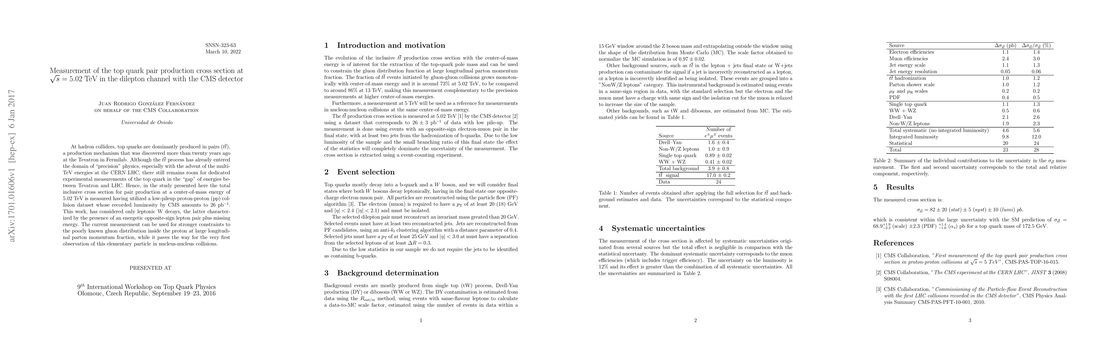 At hadron colliders, top quarks are dominantly produced in pairs ($t\bar{t}$), a production mechanism that was discovered more than twenty years ago at the Tevatron in Fermilab. Although the \ttbar process has already entered the domain of "precision" physics, especially with the advent of the multi-TeV energies at the CERN LHC, there still remains room for dedicated experimental measurements of the top quark in the "gap" of energies between Tevatron and LHC. Hence, in the study presented here the total inclusive cross section for pair production at a center-of-mass energy of 5.02 TeV is measured having utilized a low-pileup proton-proton (pp) collision dataset whose recorded luminosity by CMS amounts to 26 pb$^{-1}$. This work, has considered only leptonic W decays, the latter characterized by the presence of an energetic opposite-sign lepton pair plus missing energy. The current measurement can be used for stronger constraints to the poorly known gluon distribution inside the proton at large longitudinal parton momentum fraction, while it paves the way for the very first observation of this elementary particle in nucleus-nucleus collisions.