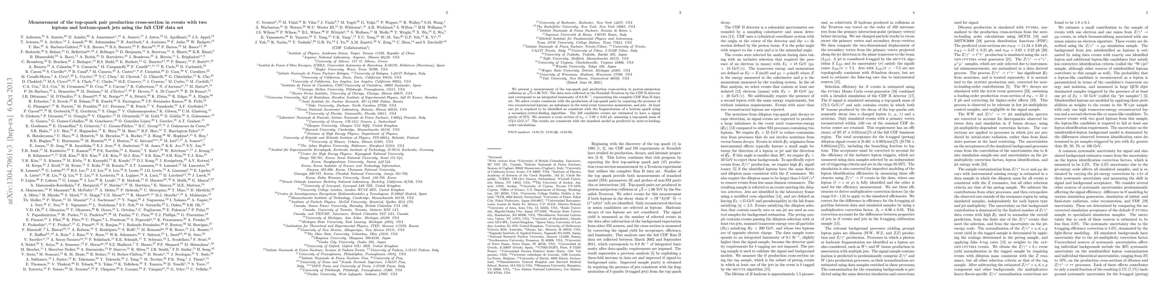We present a measurement of the top-quark pair production cross-section in proton-antiproton collisions at $\sqrt{s}$=1.96 TeV. The data were collected at the Fermilab Tevatron by the CDF II detector and correspond to an integrated luminosity of 8.8 fb$^{-1}$, representing the complete CDF Run II data set. We select events consistent with the production of top-quark pairs by requiring the presence of two reconstructed leptons, an imbalance in the total event transverse momentum, and jets. At least one jet is required to be identified as consistent with the fragmentation of a bottom quark using a secondary-vertex-finding algorithm. The 246 candidate events are estimated to have a signal purity of 91%. We measure a cross section of $\sigma_{\ttbar}$ = 7.09 $\pm$ 0.84 pb, assuming a top-quark mass of 172.5 GeV/$c^{2}$. The results are consistent with the standard model as predicted by next-to-leading-order calculations.