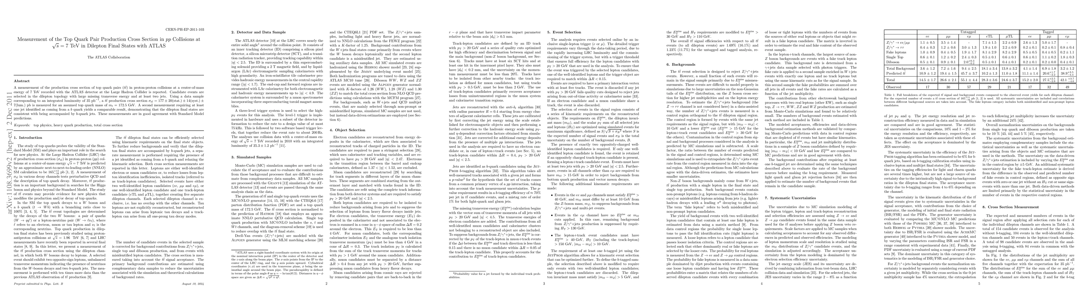 This paper reports a measurement of the top quark pair production cross section in proton-proton collisions at 7 TeV using the ATLAS detector, finding a value of 171 ± 20(stat.) ± 14(syst.) ± 8(lum.) pb. The results are consistent with Standard Model predictions and confirm the presence of b-quark jets in dilepton final states.