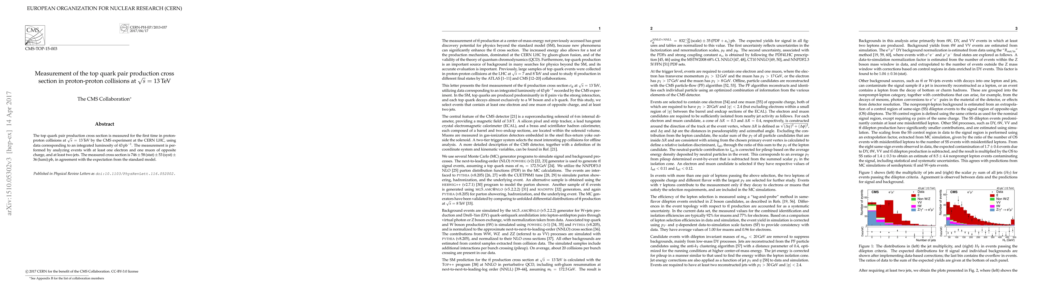 The CMS experiment at the CERN LHC measured the top quark pair production cross section for the first time at 13 TeV, obtaining a value of 746 ± 58 (stat) ± 53 (syst) ± 36 (lumi) pb, consistent with standard model predictions. The analysis utilized data from proton-proton collisions with an integrated luminosity of 43 inverse picobarns.