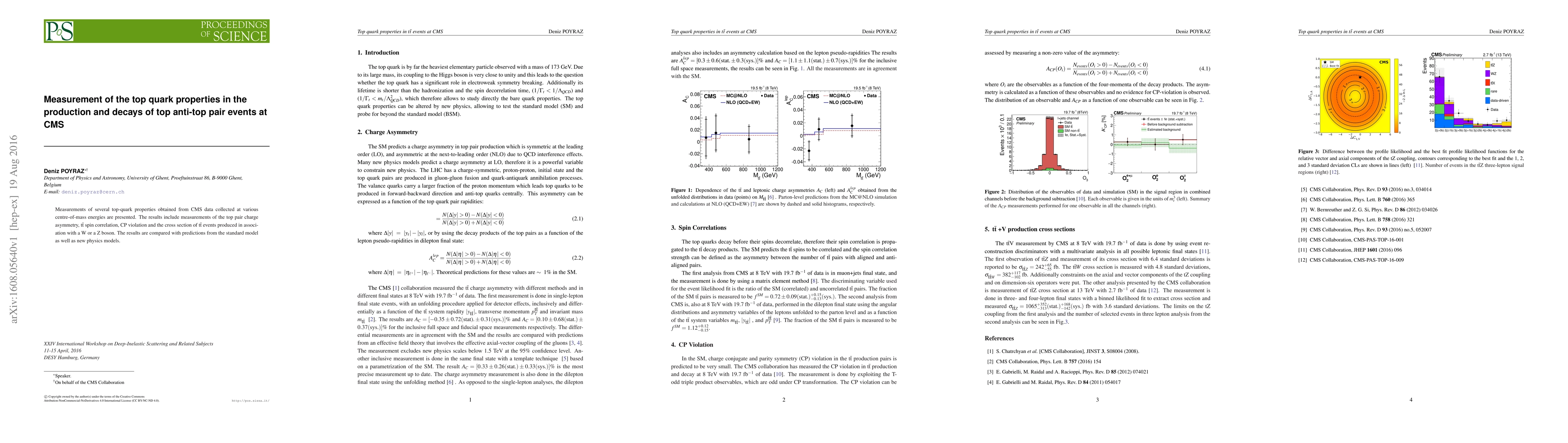 Measurements of several top-quark properties obtained from CMS data collected at various centre-of-mass energies are presented. The results include measurements of the top pair charge asymmetry, $\textrm{t}\bar{\textrm{t}}$ spin correlation, CP violation and the cross section of $\textrm{t}\bar{\textrm{t}}$ events produced in association with a W or a Z boson. The results are compared with predictions from the standard model as well as new physics models.