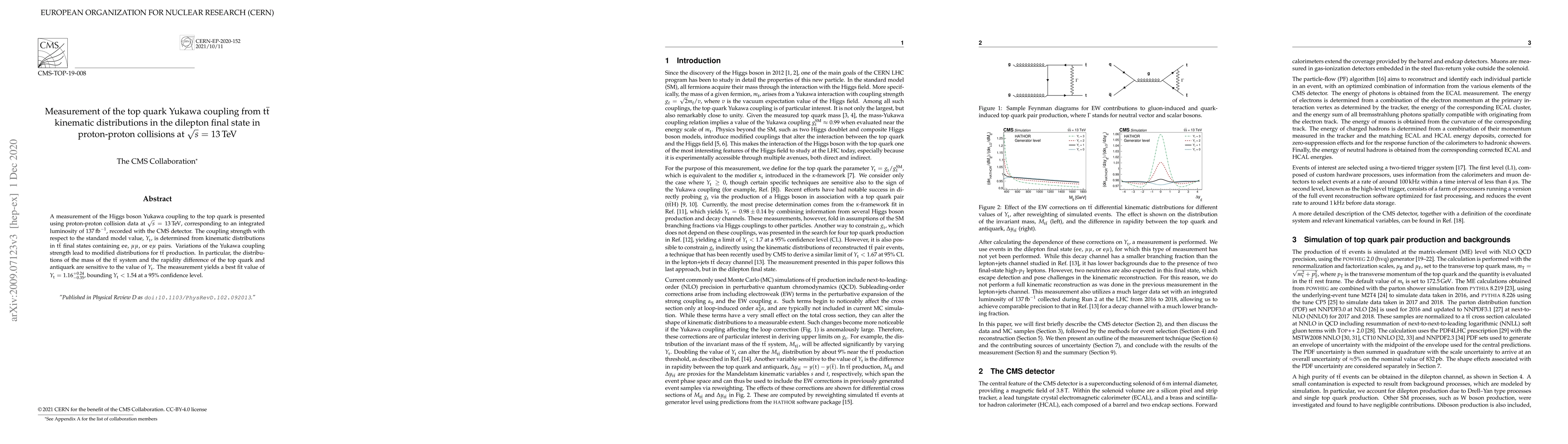 This paper measures the Higgs boson Yukawa coupling to the top quark using proton-proton collision data at 13 TeV, finding a best fit value of $Y_\mathrm{t} =$ 1.16 $^{+0.24}_{-0.35}$ and constraining $Y_\mathrm{t}$ to be less than 1.54 at 95% confidence. The analysis focuses on kinematic distributions in $\mathrm{t\bar{t}}$ final states with dilepton pairs.