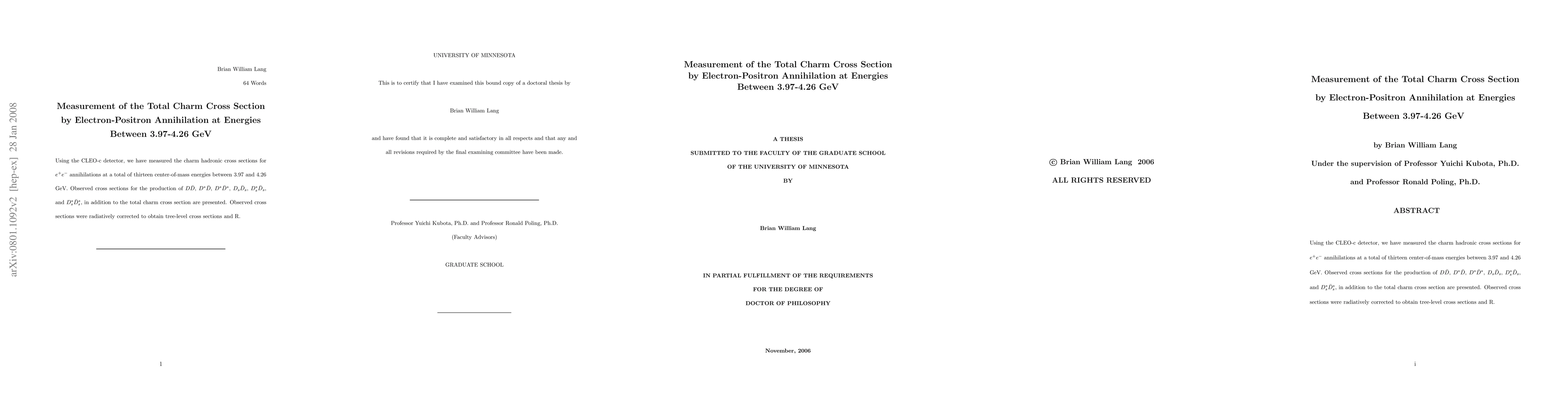 This study, conducted using the CLEO-c detector, measures the total charm cross section for $e^{+}e^{-}$ annihilations at thirteen energies between 3.97 and 4.26 GeV. The research presents detailed cross sections for various charm meson pairs, including $D\bar{D}$, $D^{*}\bar{D}$, and $D_{s}\bar{D}_{s}$ states, after radiative corrections.