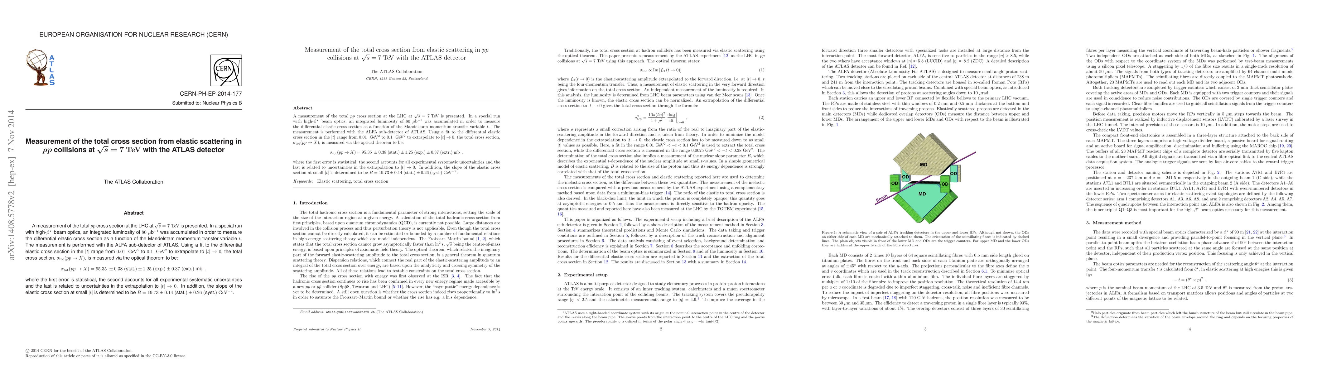 This paper reports a measurement of the total $pp$ cross section at $\sqrt{s}=7$ TeV using the ATLAS detector, yielding $\sigma_{\mathrm{tot}}(pp\rightarrow X) = 95.35 \pm 0.38 \pm 1.25 \pm 0.37$ mb, with the errors representing statistical, experimental, and extrapolation uncertainties. Additionally, the slope of the elastic cross section at small $|t|$ is determined to be $B = 19.73 \pm 0.14 \pm 0.26$ GeV$^{-2}$.
