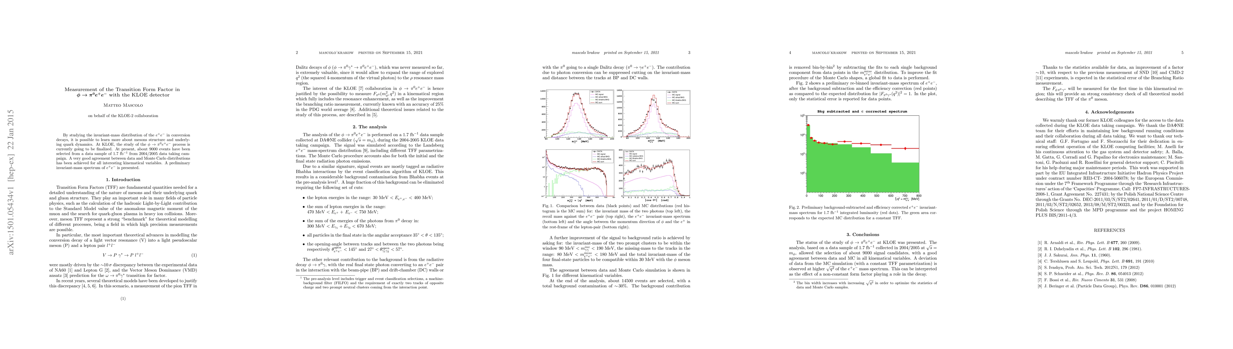 By studying the invariant-mass distribution of the $e^+e^-$ in conversion decays, it is possible to learn more about mesons structure and underlying quark dynamics. At KLOE, the study of the $\phi \to \pi^0 e^+e^-$ process is currently going to be finalized. At present, about 9000 events have been selected from a data sample of 1.7 fb$^{-1}$ from 2004/2005 data taking campaign. A very good agreement between data and Monte Carlo distributions has been achieved for all interesting kinematical variables. A preliminary invariant-mass spectrum of $e^{+}e^{-}$ is presented.