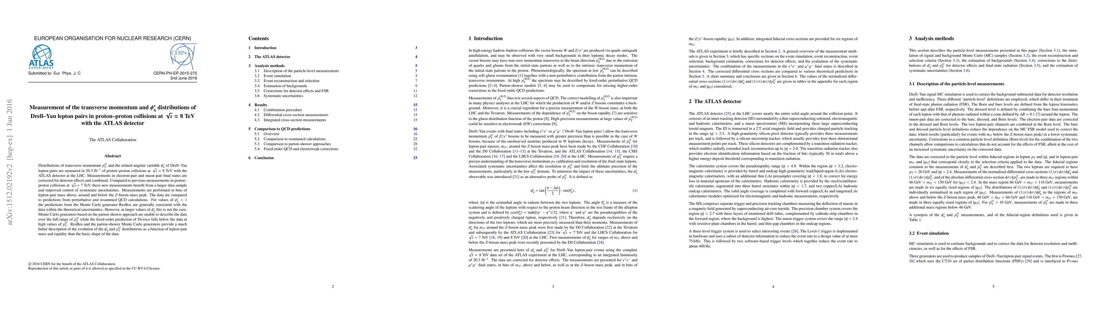 Researchers measured Drell-Yan lepton pairs in proton-proton collisions at 8 TeV using ATLAS detector, finding consistency with predictions from ResBos Monte Carlo generator for low phi^*_eta values, but discrepancies at higher values.