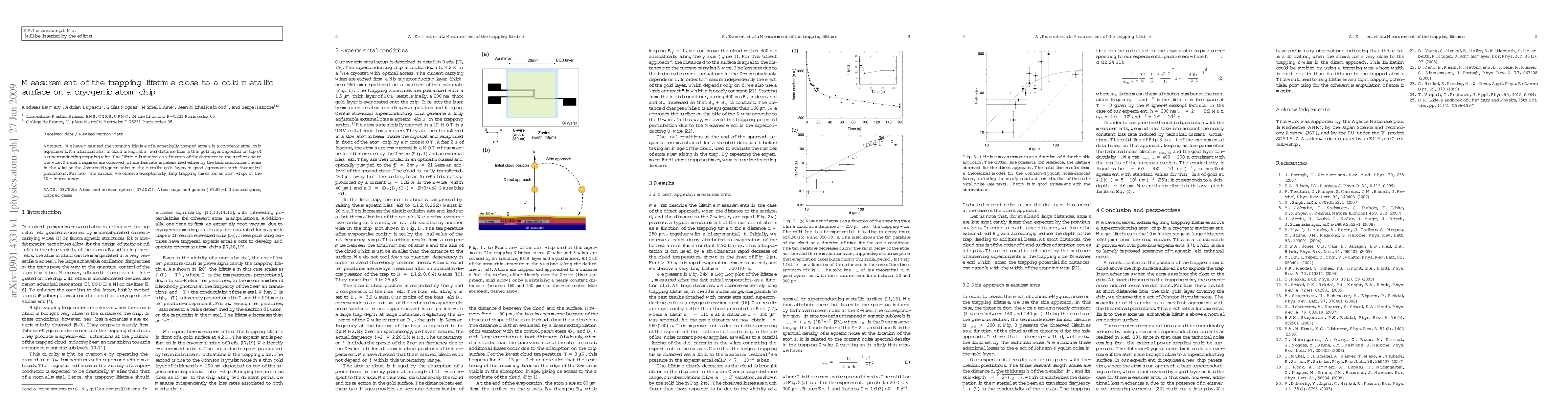 This paper measures the trapping lifetime of magnetically trapped atoms near a cold metallic surface on a cryogenic atom-chip, finding different loss regimes influenced by current and Johnson-Nyquist noise. Exceptionally long trapping times of up to 10 minutes are observed far from the surface.