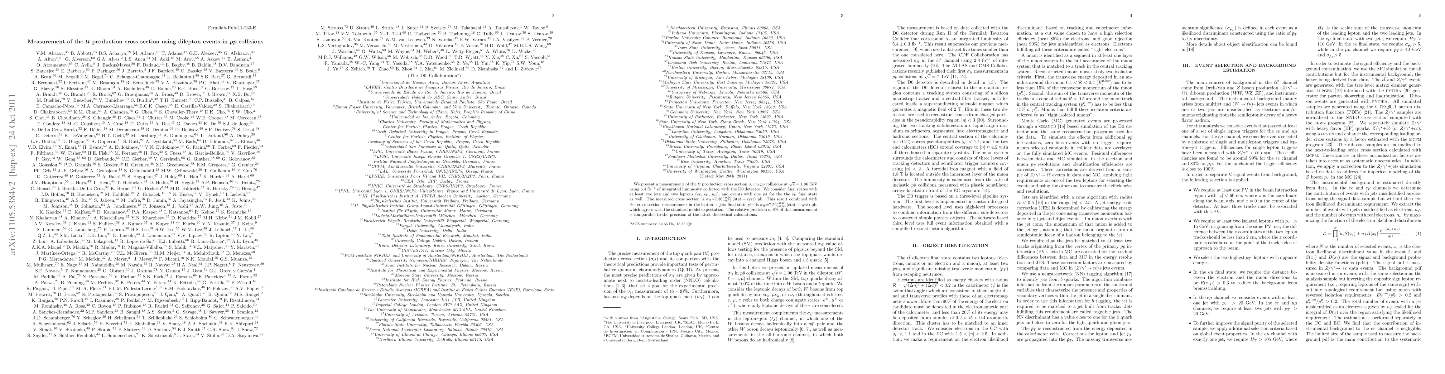 This paper measures the ttbar production cross section in ppbar collisions at 1.96 TeV using the D0 detector, finding a value of 7.36 pb with a 8% precision. The result agrees with the standard model and is comparable to the latest theoretical predictions.
