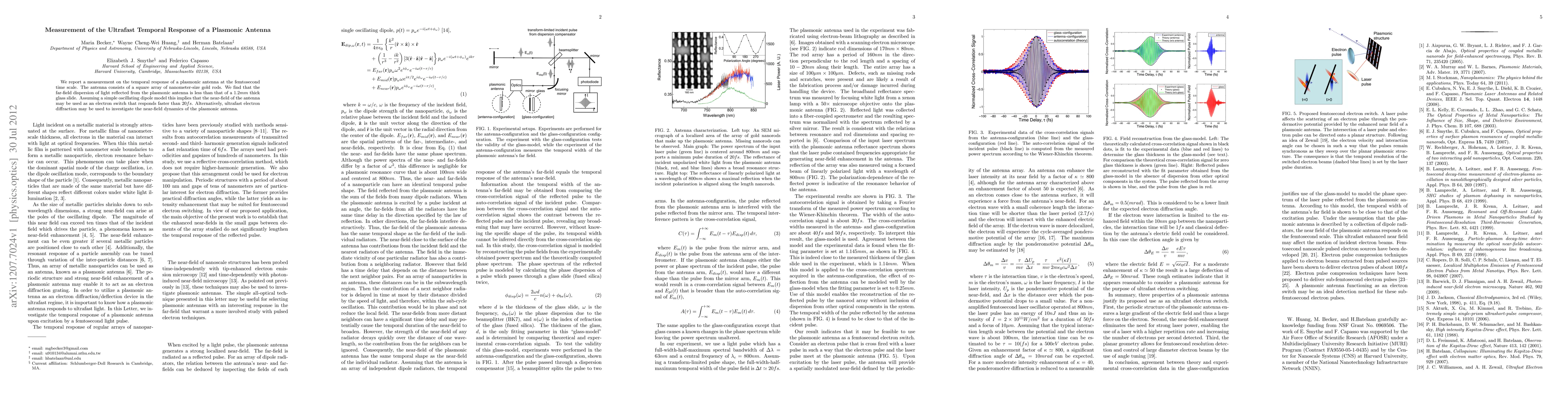 This study measures the ultrafast temporal response of a plasmonic antenna composed of gold rods, finding its far-field dispersion is significantly lower than that of glass, suggesting near-field electron switching capabilities faster than 20 femtoseconds, and proposing ultrafast electron diffraction as a method to explore its dynamics.