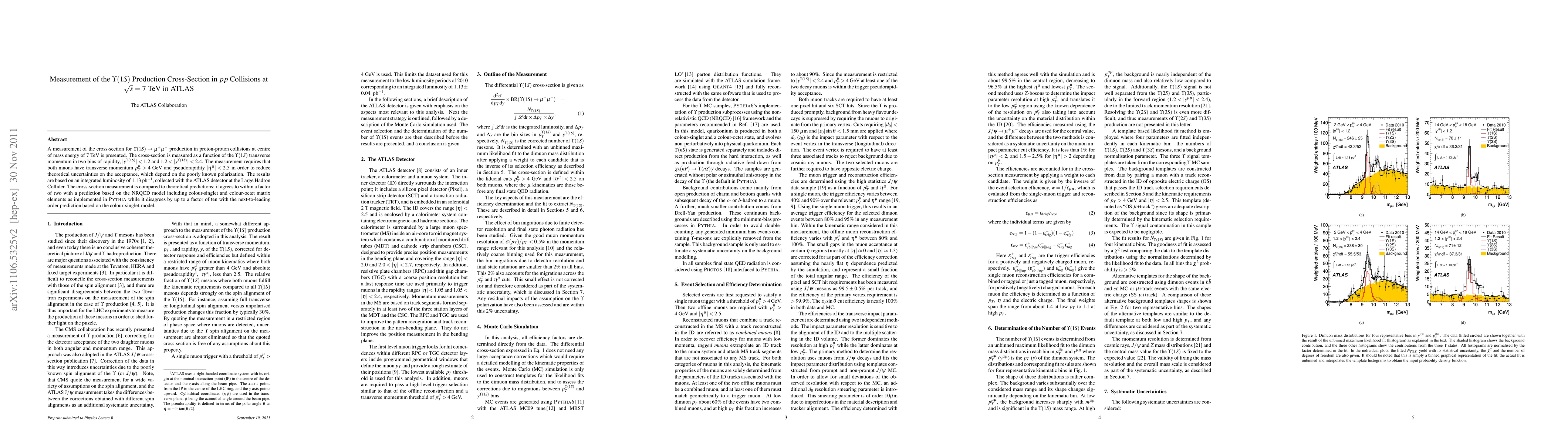 The ATLAS experiment measured the production cross-section of Upsilon(1S) particles in proton-proton collisions at 7 TeV, agreeing with a theoretical prediction based on NRQCD model but disagreeing with another prediction by up to a factor of ten.