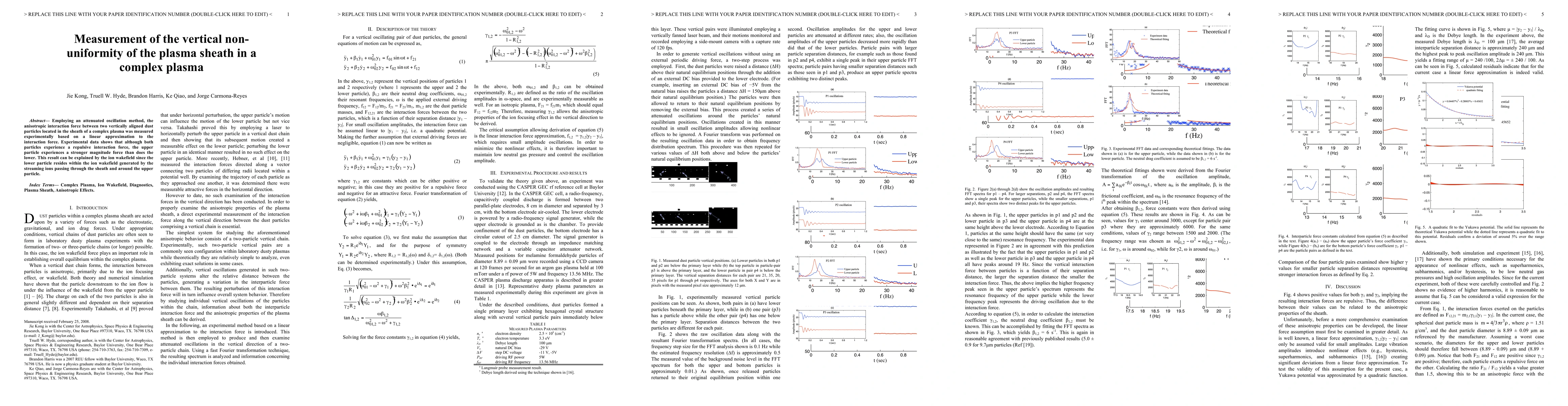 Summary: An attenuated oscillation method was used to measure the vertical non-uniformity of the plasma sheath, revealing that the upper dust particle experiences a stronger repulsive force than the lower one due to the ion wakefield effect. This indicates a significant vertical interaction force variation within the sheath.