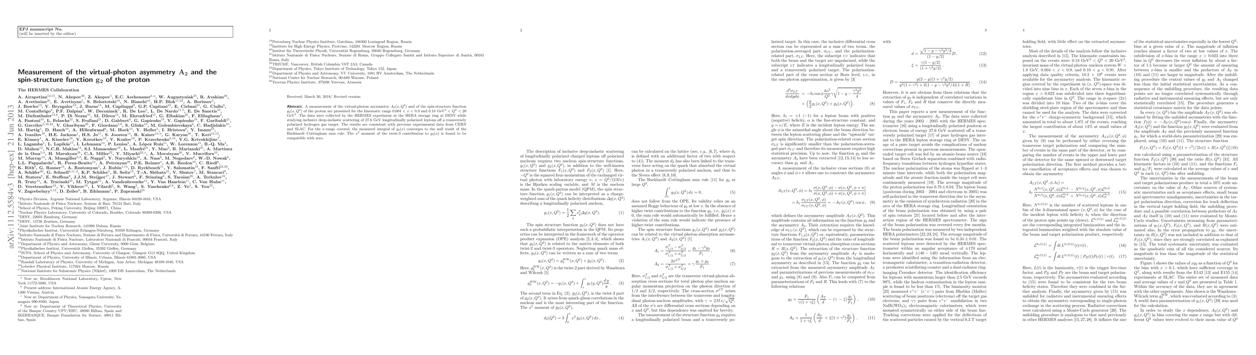 This paper reports measurements of the virtual-photon asymmetry A2 and the spin-structure function g2 of the proton from the HERMES experiment, consistent with previous data. The results support the Burkhardt-Cottingham sum rule and indicate a negligible twist-3 contribution.