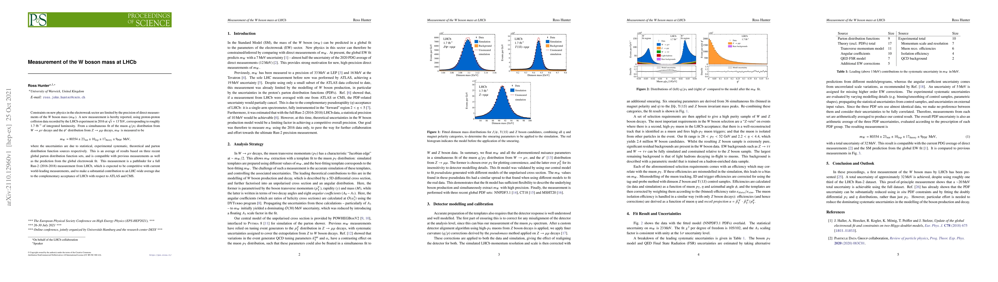 The LHCb experiment measured the W boson mass at the LHC to be $80354 \pm 23_{\textrm{stat}} \pm 10_{\textrm{exp}} \pm 17_{\textrm{theory}} \pm 9_{\textrm{PDF}} \,\textrm{MeV}$, contributing to constraints on new physics and complementing existing measurements. This result paves the way for more precise measurements during Run-2.