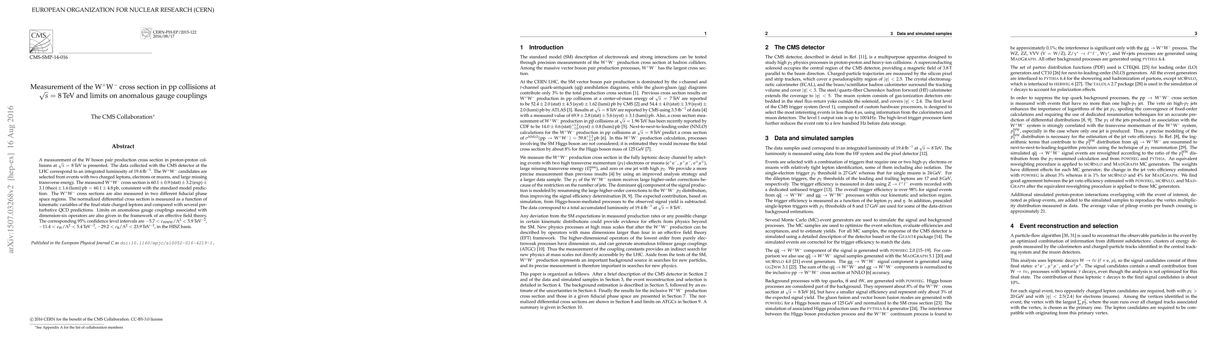 The CMS detector measured the W+ W- cross section in proton-proton collisions at sqrt(s) = 8 TeV with an integrated luminosity of 19.4 inverse femtobarns, confirming standard model predictions and setting limits on anomalous gauge couplings.