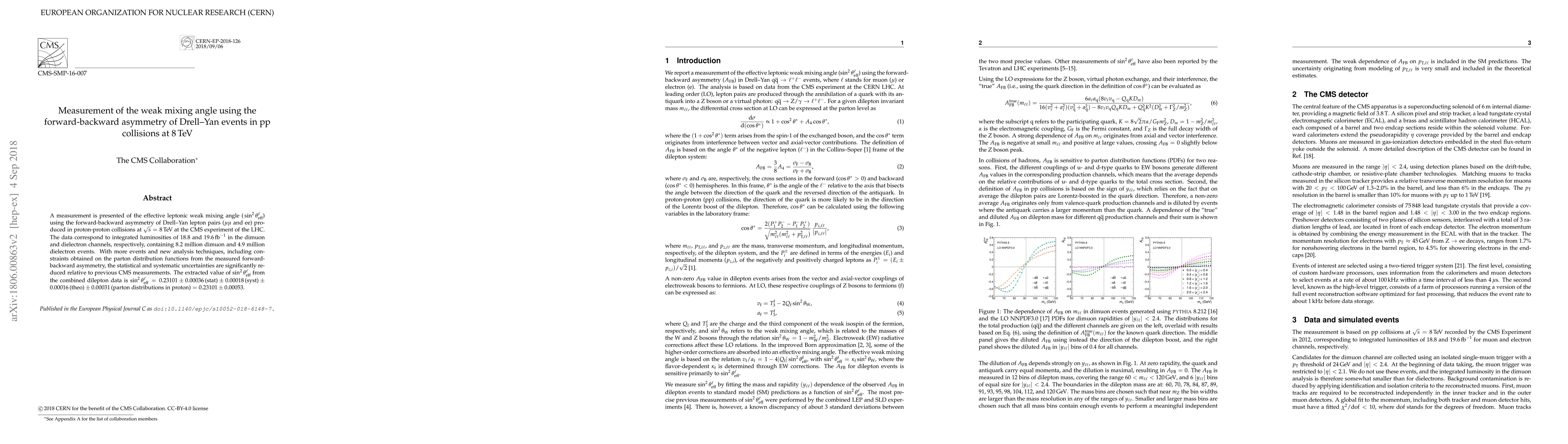 This paper measures the effective leptonic weak mixing angle using the forward-backward asymmetry of Drell-Yan events in pp collisions at 8 TeV at the CMS experiment. The result, $\sin^2\theta^{\ell}_{\text{eff}} = 0.23101 \pm 0.00053$, benefits from improved data and analysis techniques, leading to reduced uncertainties.