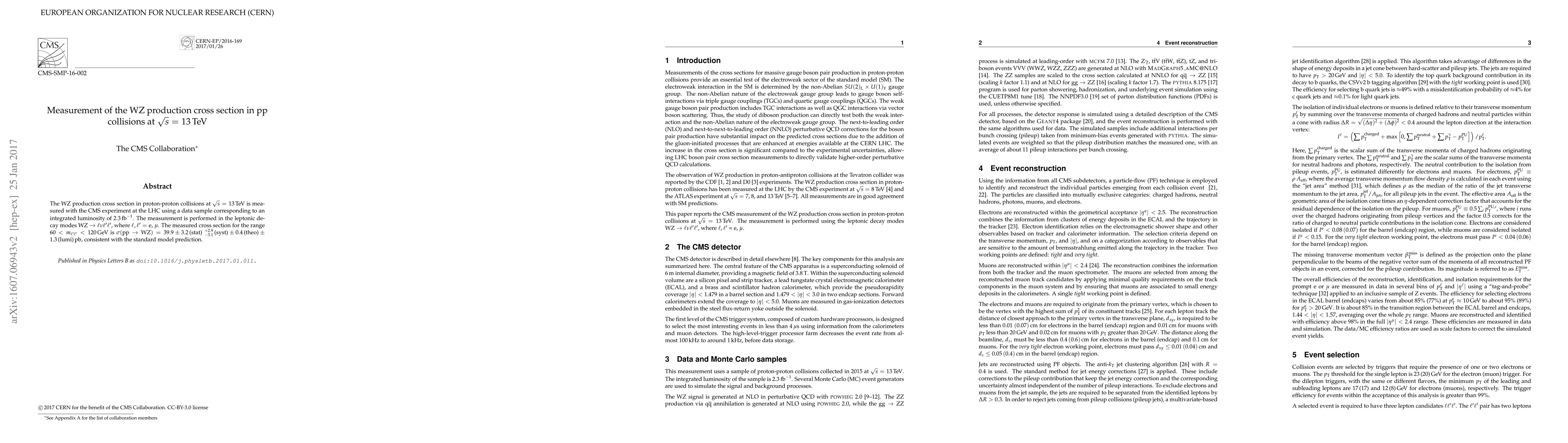 The CMS experiment at the LHC measured the WZ production cross section in proton-proton collisions at 13 TeV, finding a value of 39.9 ± 3.2 pb, consistent with standard model predictions. The measurement uses a data sample corresponding to 2.3 inverse femtobarns of integrated luminosity.