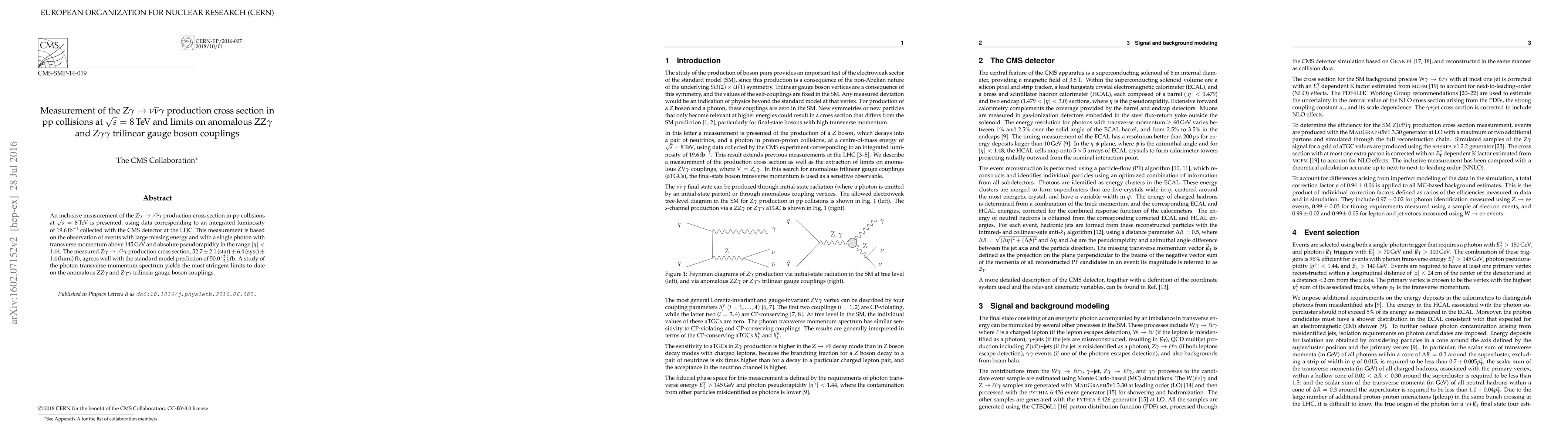 This paper reports a measurement of the Z gamma to nu nu-bar gamma production cross section in proton-proton collisions at 8 TeV, finding agreement with standard model predictions, and sets stringent limits on anomalous Z-Z-gamma and Z-gamma-gamma trilinear gauge boson couplings.