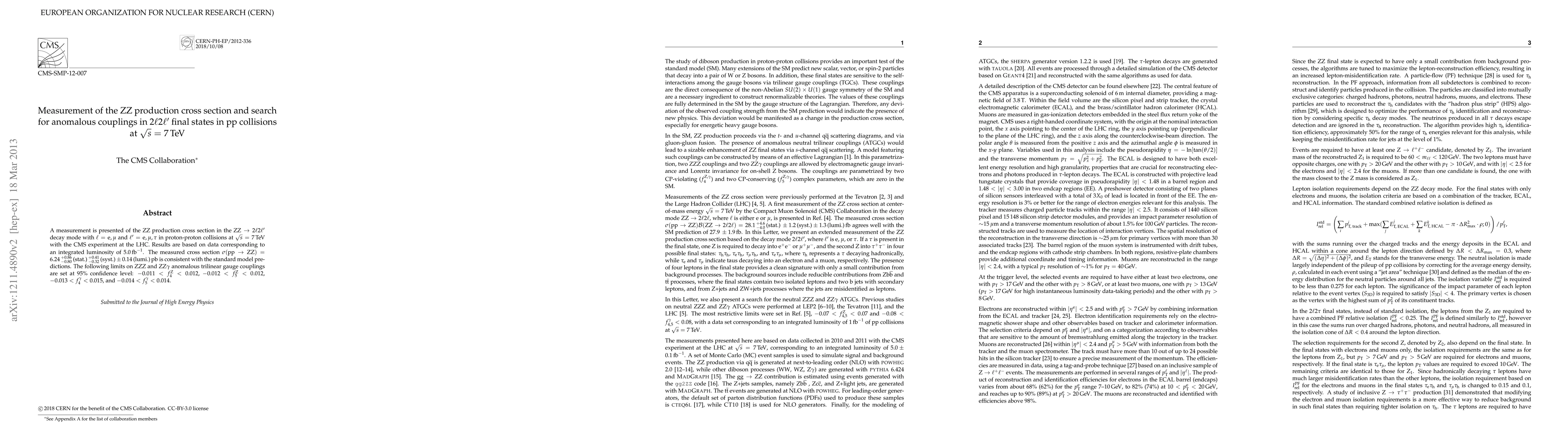 This paper measures the ZZ production cross section in proton-proton collisions at 7 TeV using the CMS experiment, finding it consistent with standard model predictions. It also sets limits on anomalous trilinear gauge couplings ZZZ and ZZ gamma.