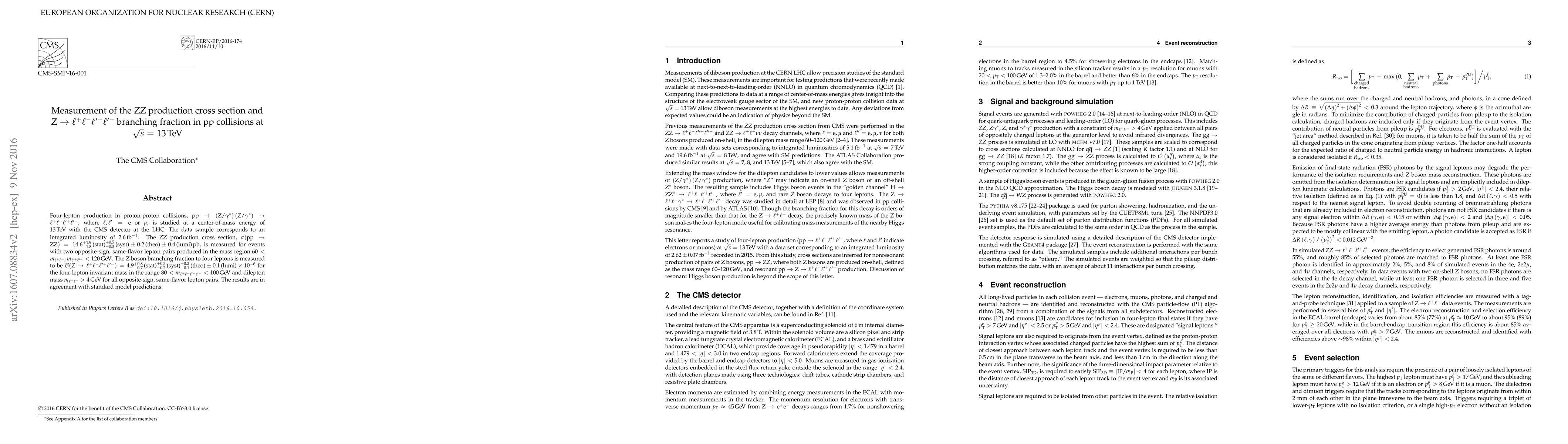 This study measures the ZZ production cross section and Z boson branching fraction to four leptons in proton-proton collisions at 13 TeV using the CMS detector. The results are consistent with standard model predictions.