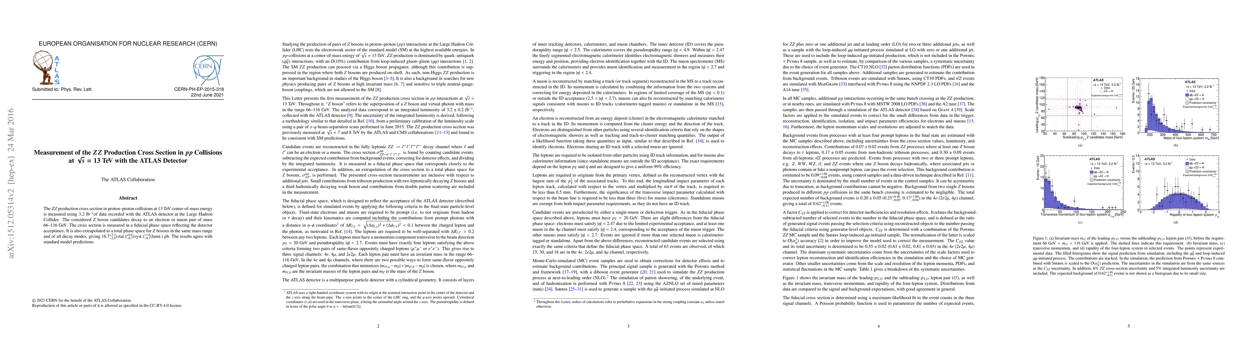 The $ZZ$ production cross section in proton-proton collisions at 13 TeV center-of-mass energy is measured using 3.2 fb$^{-1}$ of data recorded with the ATLAS detector at the Large Hadron Collider. The considered $Z$ boson candidates decay to an electron or muon pair of mass 66-116 GeV. The cross section is measured in a fiducial phase space reflecting the detector acceptance. It is also extrapolated to a total phase space for $Z$ bosons in the same mass range and of all decay modes, giving $16.7^{+2.2}_{-2.0}$(stat.)$^{+0.9}_{-0.7}$(syst.)$^{+1.0}_{-0.7}$(lumi.) pb. The results agree with standard model predictions.