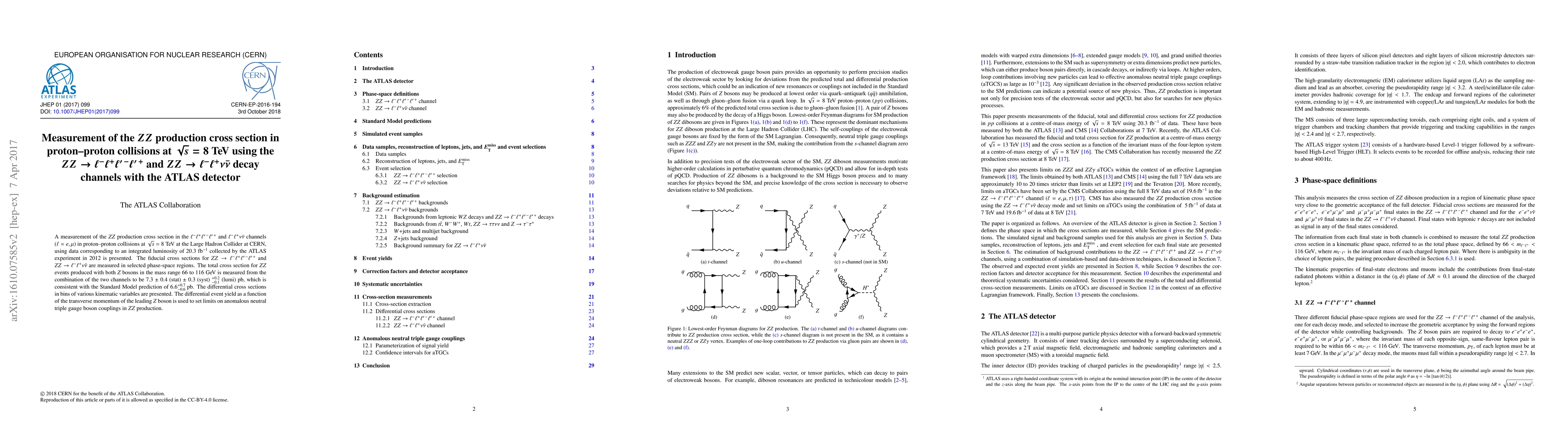 Physicists at ATLAS measured the ZZ production cross section in proton-proton collisions at 8 TeV, finding a total cross section of $7.3 ext{ pb}$ that is consistent with Standard Model predictions.