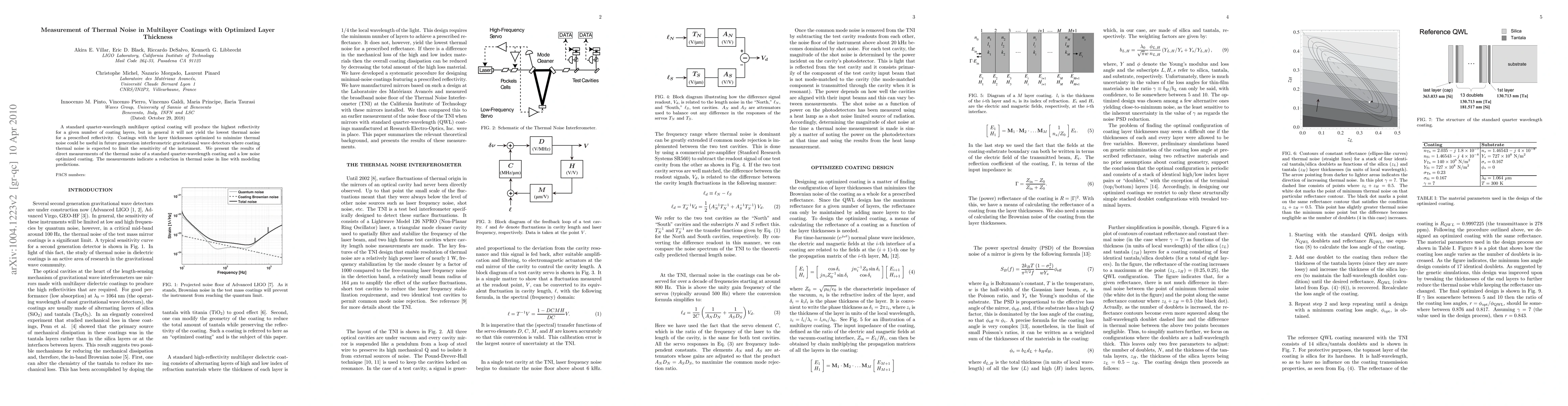 The research presents direct measurements of thermal noise in two optical coatings: a standard quarter-wavelength (QWL) coating and an optimized low-noise coating, designed to minimize thermal noise for a given reflectivity. The methodology involves using a spectrometer analyzer to measure the power spectral density (PSD) at the instrument readout and converting it to an equivalent length noise spectrum using Eq.(2).