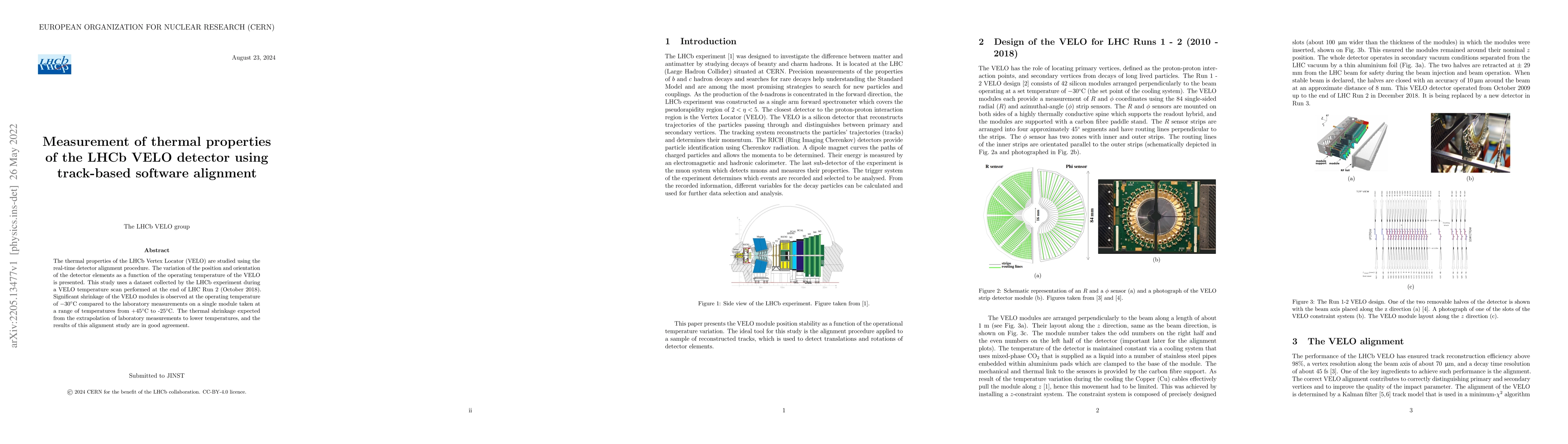 This study measures the thermal properties of the LHCb VELO detector using track-based software alignment during a temperature scan. It finds significant shrinkage of VELO modules at $-30^\circ$ compared to laboratory measurements, with alignment results aligning well with extrapolated thermal shrinkage.