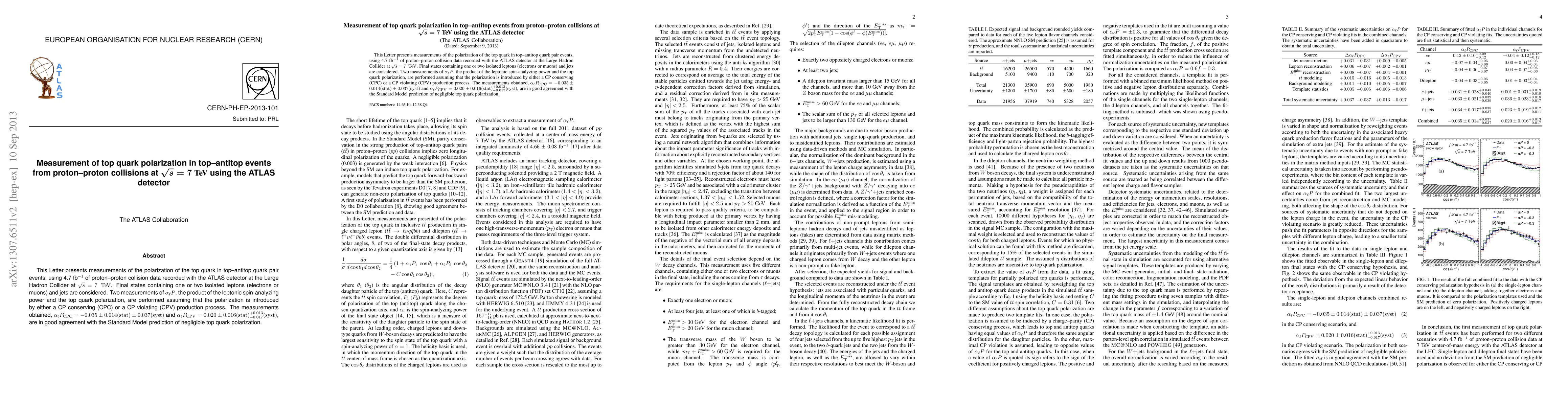 This paper reports measurements of top quark polarization in top-antitop events at 7 TeV using ATLAS data, finding no significant polarization and results consistent with Standard Model predictions. The study considers leptonic final states and assesses CP conserving and violating scenarios.