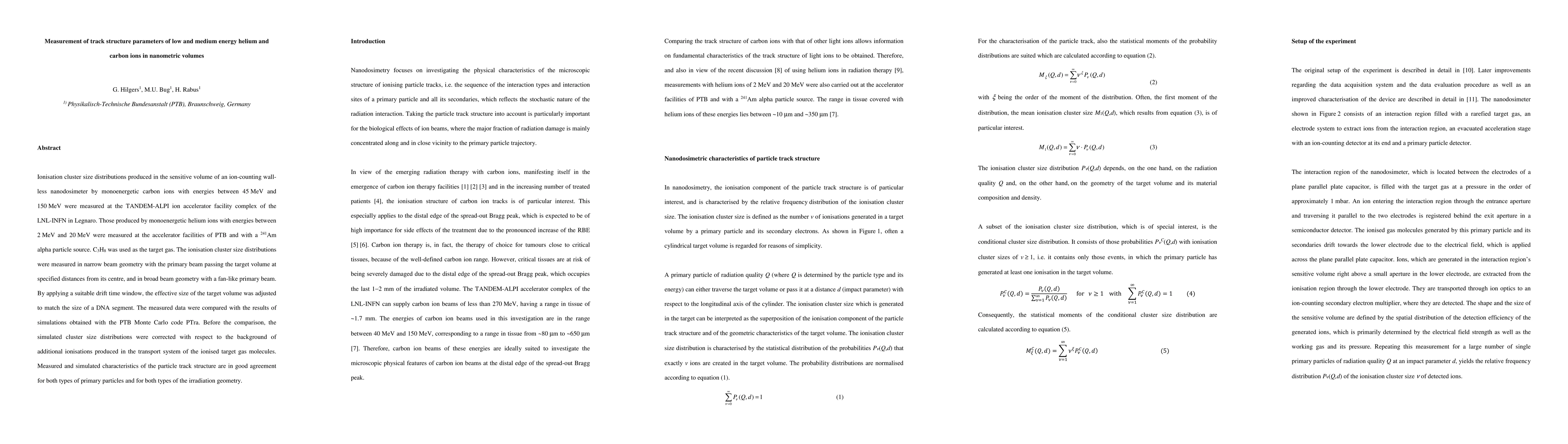 This study measures ionization cluster size distributions from carbon ions (45-150 MeV) and helium ions (2-20 MeV) in a nanodosimeter, comparing experimental data with simulations from the PTB Monte Carlo code PTra. Both types of particles show good agreement between measured and simulated track structure parameters in different beam geometries.