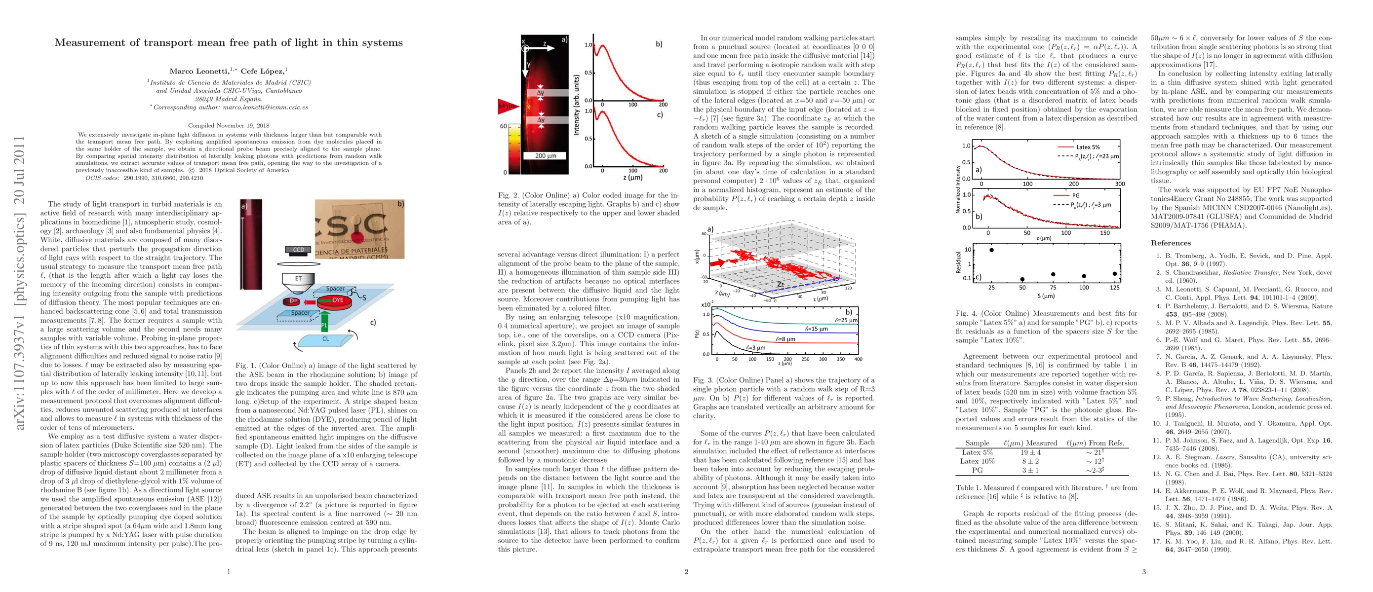 This study measures the transport mean free path of light in thin systems using amplified spontaneous emission from dye molecules. By comparing experimental data of laterally leaking photons with random walk simulations, it accurately determines the transport mean free path, enabling new investigations into previously inaccessible samples.