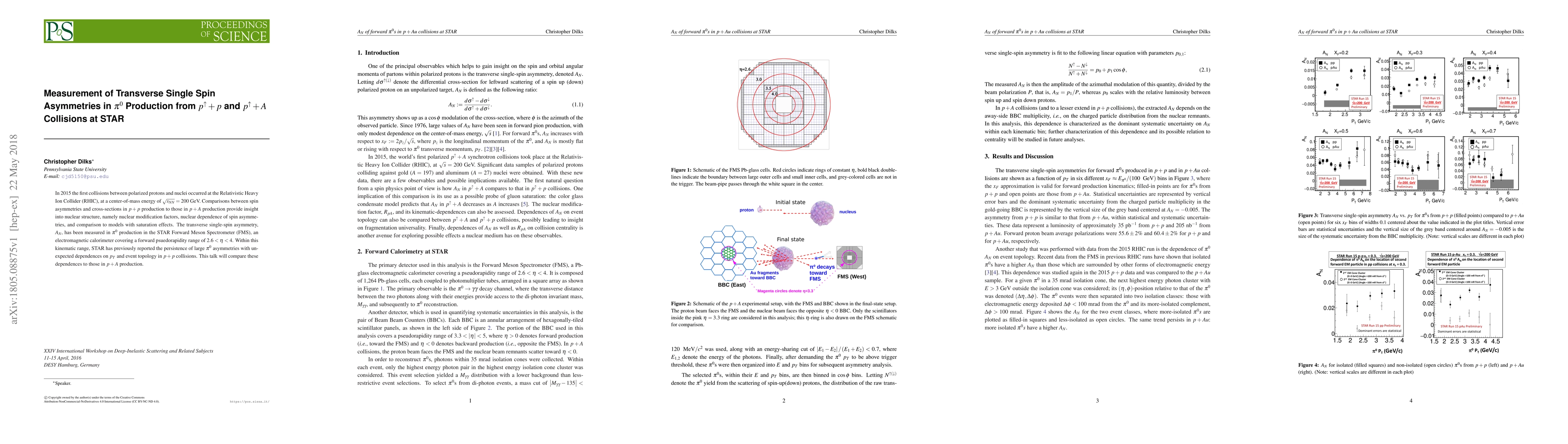 In 2015 the first collisions between polarized protons and nuclei occurred at the Relativistic Heavy Ion Collider (RHIC), at a center-of-mass energy of $\sqrt{s_{NN}}=200$ GeV. Comparisons between spin asymmetries and cross-sections in $p+p$ production to those in $p+A$ production provide insight into nuclear structure, namely nuclear modification factors, nuclear dependence of spin asymmetries, and comparison to models with saturation effects. The transverse single-spin asymmetry, $A_{N}$, has been measured in $\pi^{0}$ production in the STAR Forward Meson Spectrometer (FMS), an electromagnetic calorimeter covering a forward psuedorapidity range of $2.6<\eta<4$. Within this kinematic range, STAR has previously reported the persistence of large $\pi^0$ asymmetries with unexpected dependences on $p_T$ and event topology in $p+p$ collisions. This talk will compare these dependences to those in $p+A$ production.