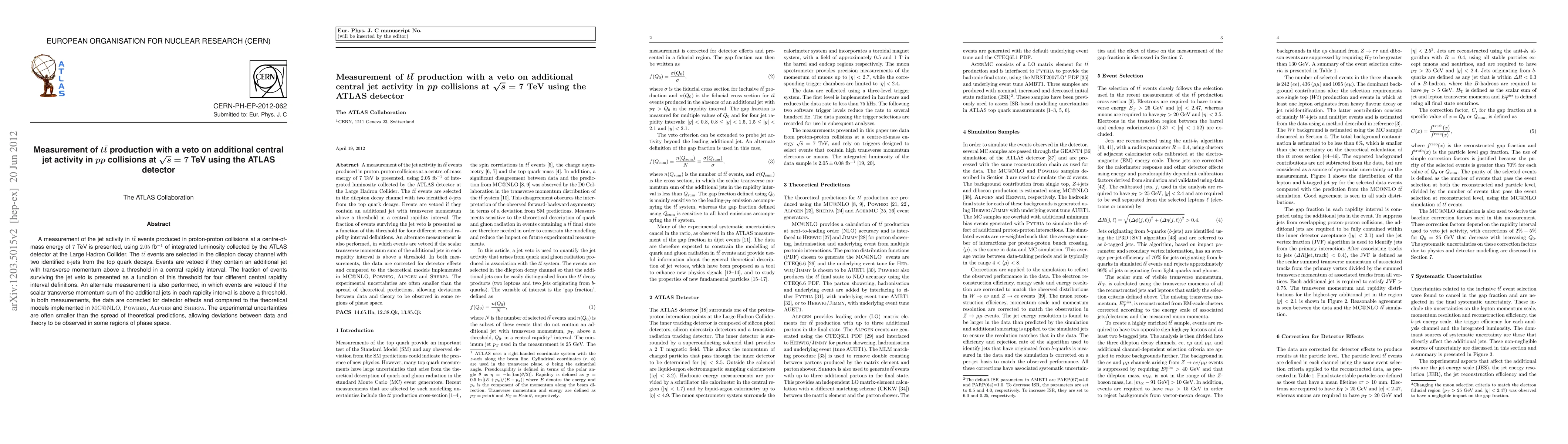 This paper measures ttbar production in proton-proton collisions at 7 TeV using 2.05 fb^-1 of ATLAS data, focusing on jet activity with a veto on additional central jets. It compares the fraction of surviving events to theoretical models, noting deviations in some regions.