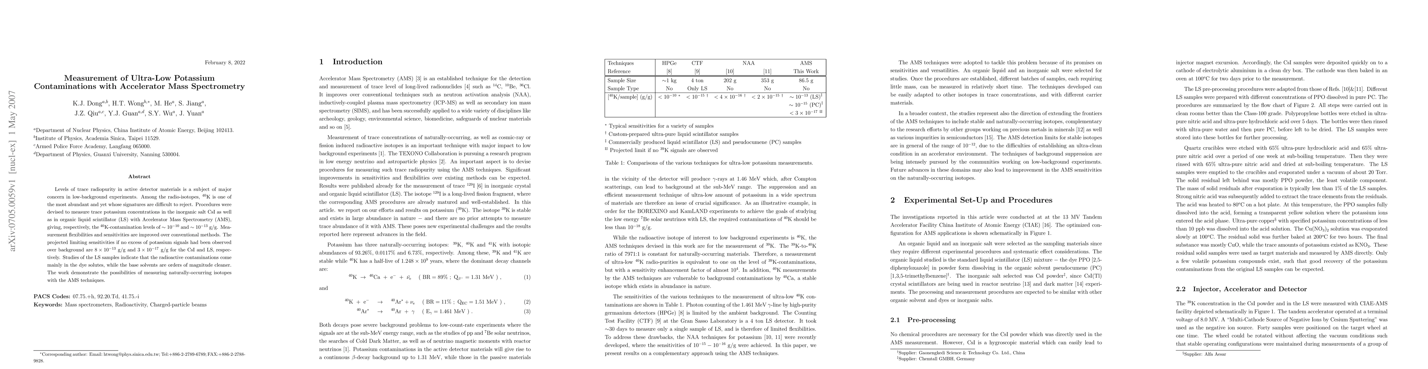 Levels of trace radiopurity in active detector materials is a subject of major concern in low-background experiments. Among the radio-isotopes, $\k40$ is one of the most abundant and yet whose signatures are difficult to reject. Procedures were devised to measure trace potassium concentrations in the inorganic salt CsI as well as in organic liquid scintillator (LS) with Accelerator Mass Spectrometry (AMS), giving, respectively, the $\k40$-contamination levels of $\sim 10^{-10}$ and $\sim 10^{-13}$ g/g. Measurement flexibilities and sensitivities are improved over conventional methods. The projected limiting sensitivities if no excess of potassium signals had been observed over background are $8 \times 10^{-13}$ g/g and $3 \times 10^{-17}$ g/g for the CsI and LS, respectively. Studies of the LS samples indicate that the radioactive contaminations come mainly in the dye solutes, while the base solvents are orders of magnitude cleaner. The work demonstrate the possibilities of measuring naturally-occurring isotopes with the AMS techniques.
