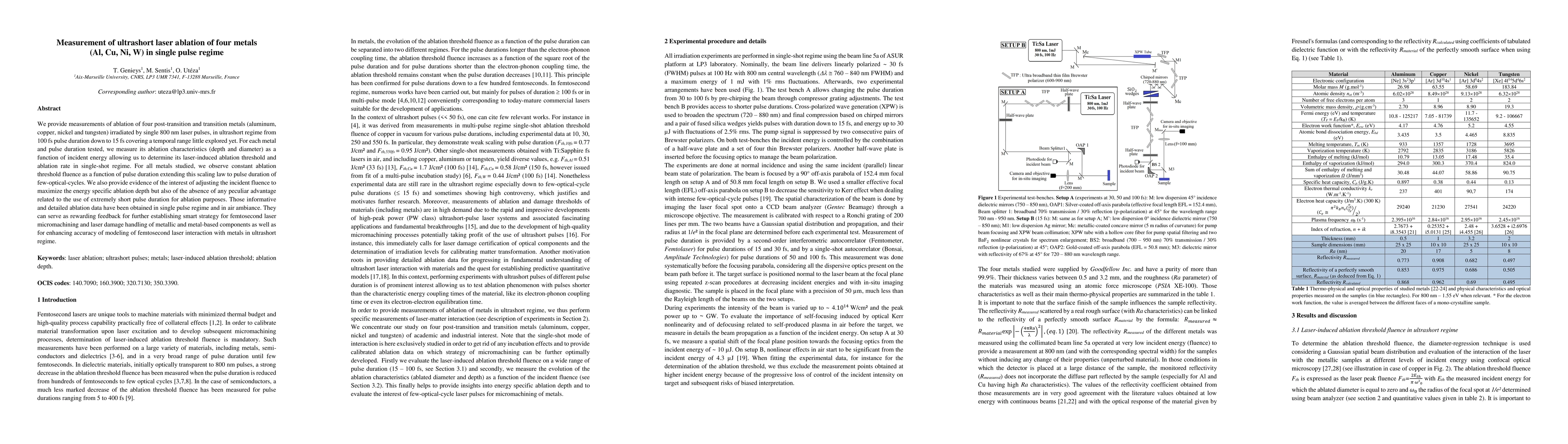 This study measures the ablation characteristics of aluminum, copper, nickel, and tungsten metals using single 800 nm laser pulses ranging from 100 fs to 15 fs. The research finds a constant ablation threshold fluence across pulse durations, indicating no significant advantage of ultrashort pulses for ablation, and provides valuable data for femtosecond laser micromachining and modeling.