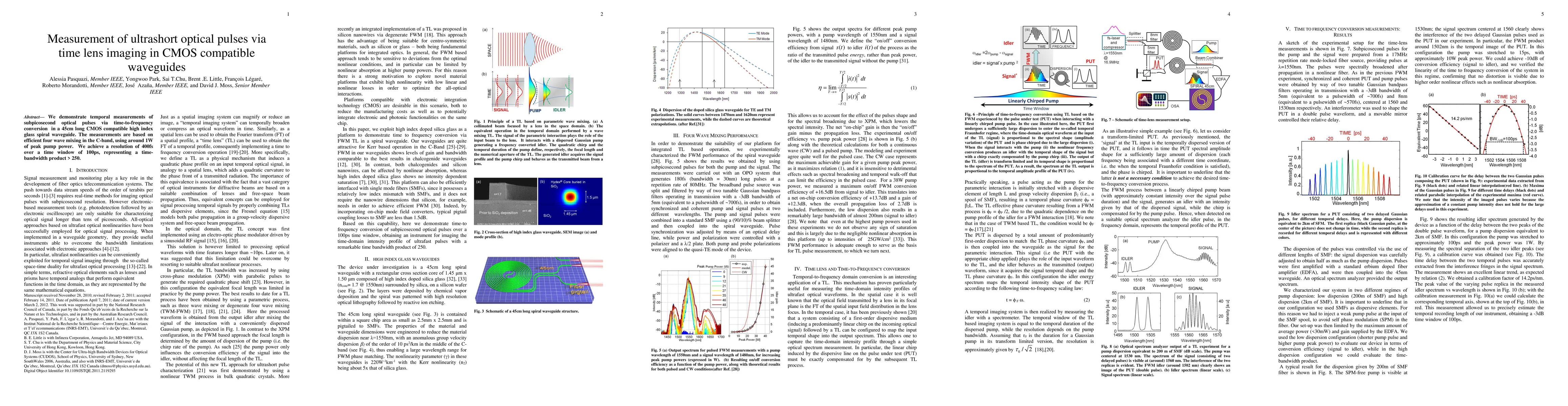 Researchers demonstrated a method to measure ultrashort optical pulses using time lens imaging in CMOS-compatible waveguides, achieving a resolution of 400fs over 100ps.