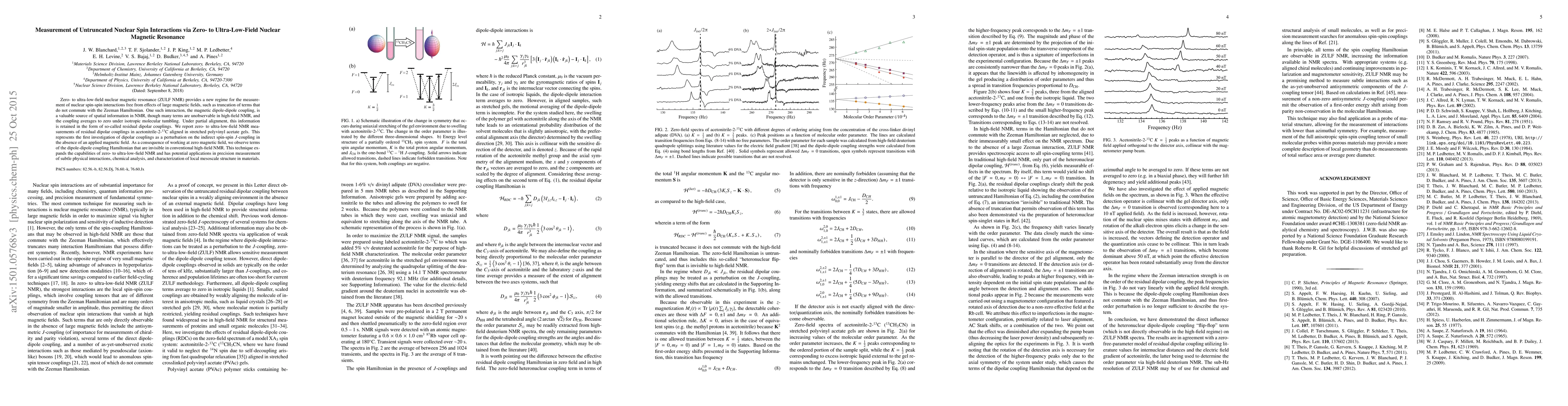 This paper reports on the use of zero- to ultra-low-field nuclear magnetic resonance (ZULF NMR) to measure untruncated nuclear spin interactions, specifically residual dipolar couplings in acetonitrile-2-$^{13}$C, revealing terms of the dipole-dipole coupling Hamiltonian invisible in conventional high-field NMR. This technique enhances the precision measurement of physical interactions and local mesoscale structure in materials.