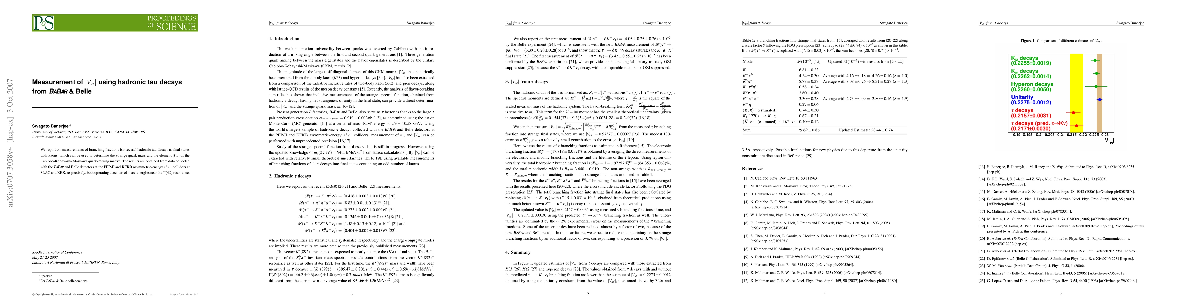 We report on measurements of branching fractions for several hadronic tau decays to final states with kaons, which can be used to determine the strange quark mass and the element |V_us| of the Cabibbo-Kobayashi-Maskawa quark-mixing matrix. The results are obtained from data collected with the BaBar and Belle detectors at the PEP-II and KEKB asymmetric-energy e+e- colliders at SLAC and KEK, respectively, both operating at center-of-mass energies near the Y(4S) resonance.