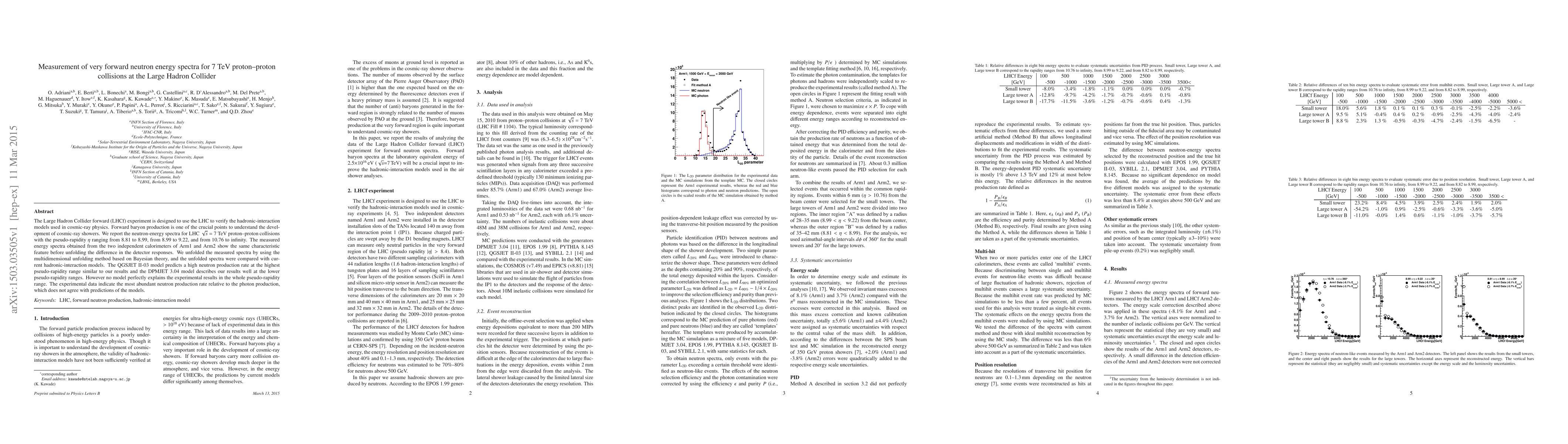 The LHCf experiment measured neutron energy spectra in very forward regions for 7 TeV proton-proton collisions, revealing discrepancies between experimental data and current hadronic-interaction models across different pseudo-rapidity ranges. While some models partially match the results, none fully explain the observed neutron production rates.