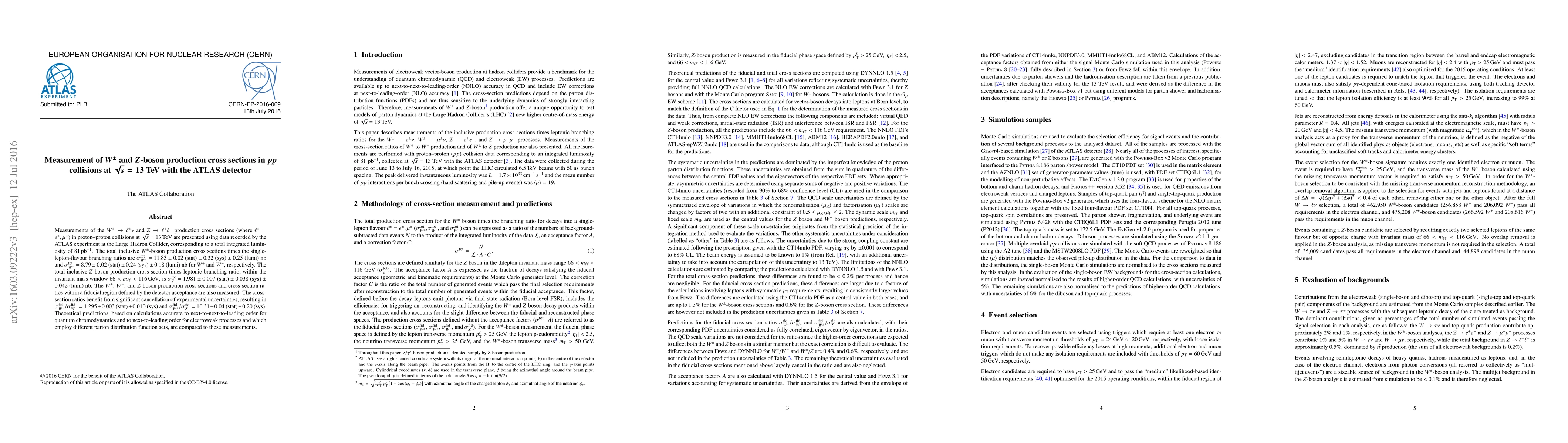 This paper presents cross-section measurements for $W^{\pm}$ and $Z$-boson production in proton-proton collisions at $\sqrt{s}=13$ TeV using the ATLAS detector, finding $\sigma_{W^+}^{tot} = 11.83$ nb, $\sigma_{W^-}^{tot} = 8.79$ nb, and $\sigma_{Z}^{tot} = 1.981$ nb, and compares these results to theoretical predictions.