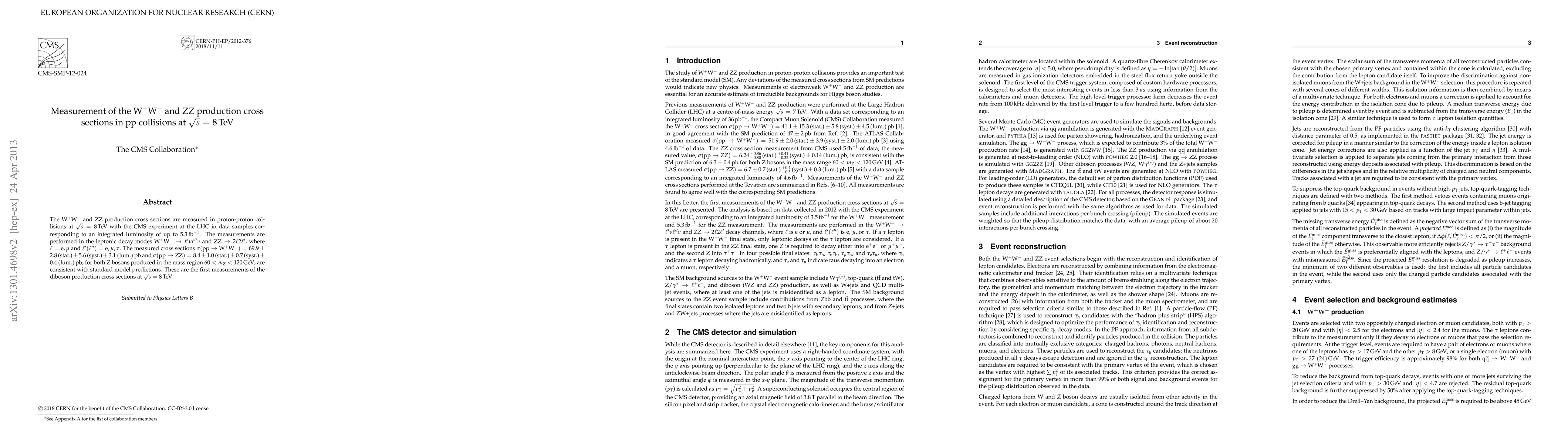 The CMS experiment at the LHC measured W+W- and ZZ production cross sections in proton-proton collisions at sqrt(s) = 8 TeV, finding values consistent with standard model predictions: sigma(pp to W+W-) = 69.9 ± 2.8 pb and sigma(pp to ZZ) = 8.4 ± 1.0 pb. These are the first such measurements at this energy.