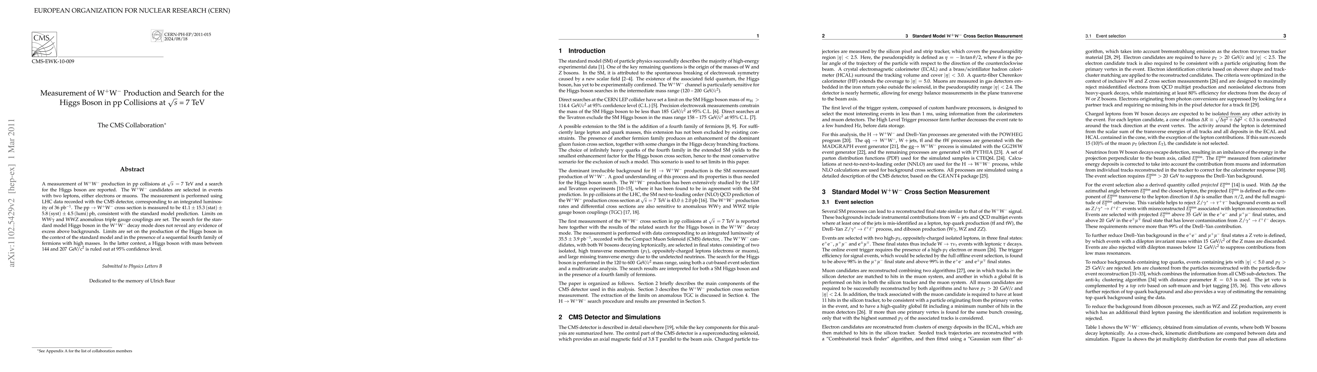 This paper reports a measurement of WW production in proton-proton collisions at 7 TeV and a search for the Higgs boson using the CMS detector at LHC. The WW cross section is consistent with the standard model, while no evidence of the Higgs boson is found, leading to exclusion limits on its production in specific scenarios.