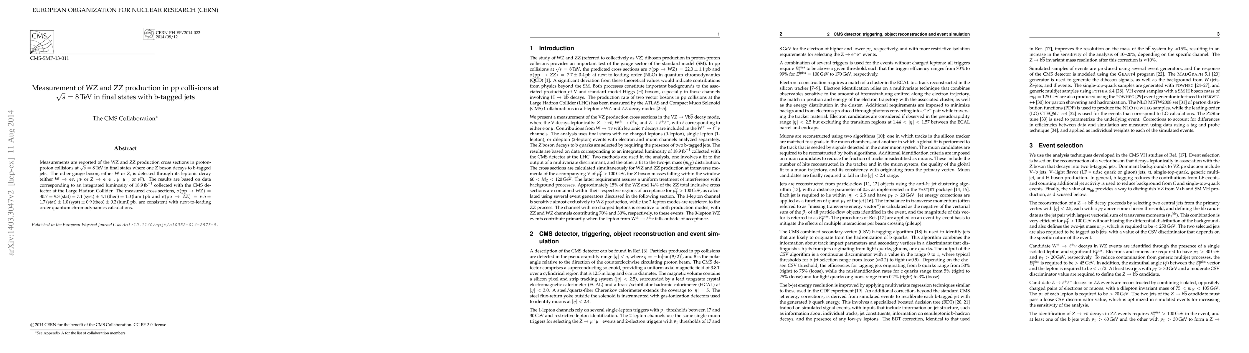 This paper reports measurements of WZ and ZZ production cross sections in proton-proton collisions at 8 TeV, focusing on final states with b-tagged jets. Results are consistent with next-to-leading order quantum chromodynamics calculations.
